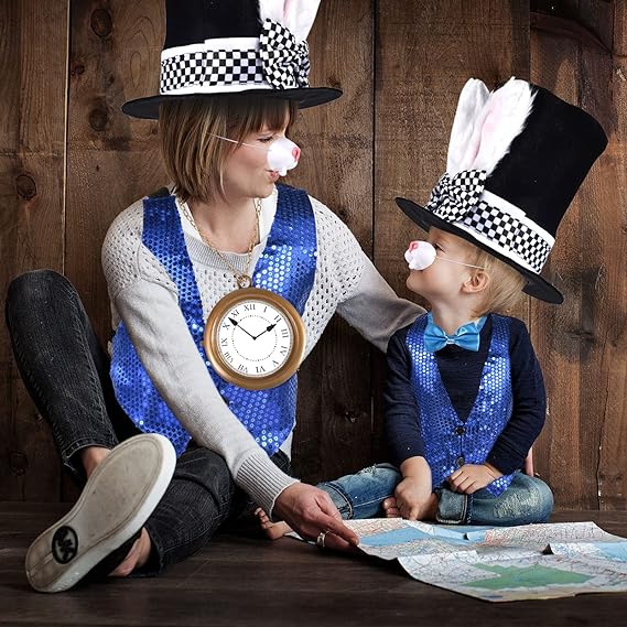Для взрослых и детей: галстук-бабочка и жилет регулируются, а хвост и Носик у зайчика гибкий. Один размер подходит большинству взрослых, детей и подростков. Дополните свой образ белого кролика нашим жилетом с пайетками, шапкой с кроличьими ушками и большим ожерельем в виде часов. Это сделает вас более нежным и элегантным и станет самым ярким кроликом.