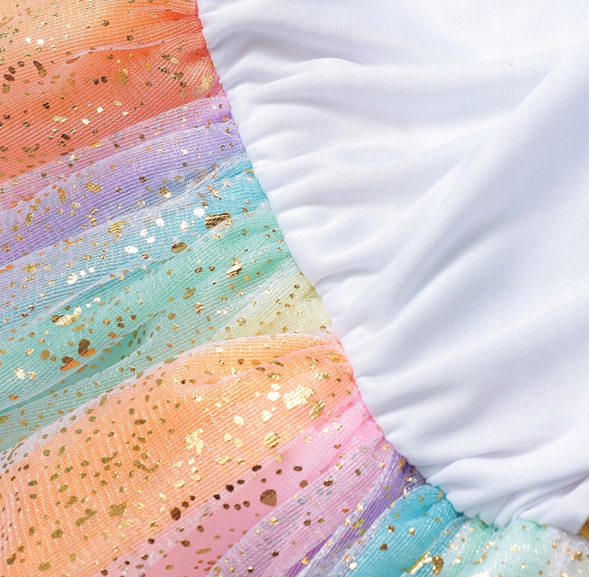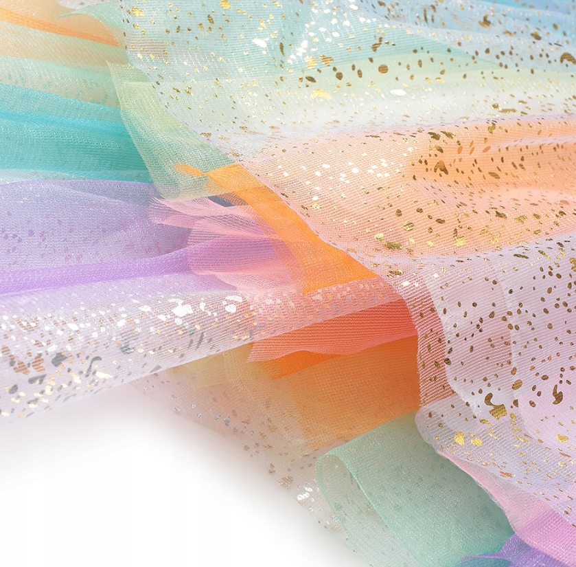 Радужное платье не прозрачное, оно состоит из тюля и металлизированного слоя, создающего блестящий эффект. Платье асимметричное, спинка длиннее. Он прекрасно отражает свет.