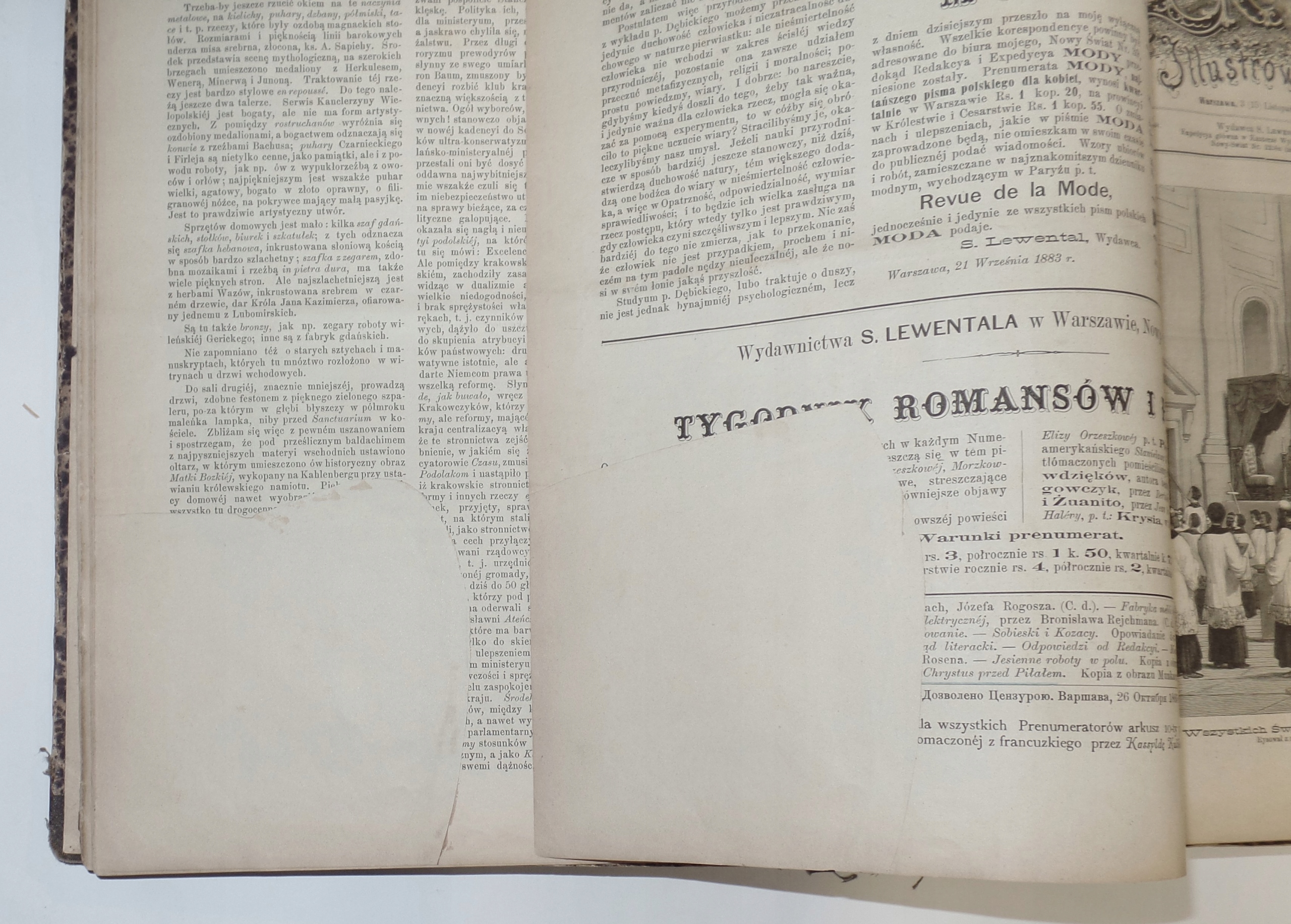 Журналы в обстановке- от № 933 (5 мая 1883 г.) до № 1019 от 27 декабря 1884 года, с юбилеем номера 1000, неполным. В обстановке числа от 933 959 до 986,988 до 1011,1013 до 1015 и с 1017 до 1019. На копиях пост -марки застряли, чтобы подтвердить подписку на Галицию. Фолио, многочисленные ксилографии в тексте и полная страница и двойная страница. Светильник с повреждением с повреждением и подростками. Grząbiem завернут в вторичный материал. Поведение, две стороны с дольками на полостях, видимые пятна, обесцвечивание.