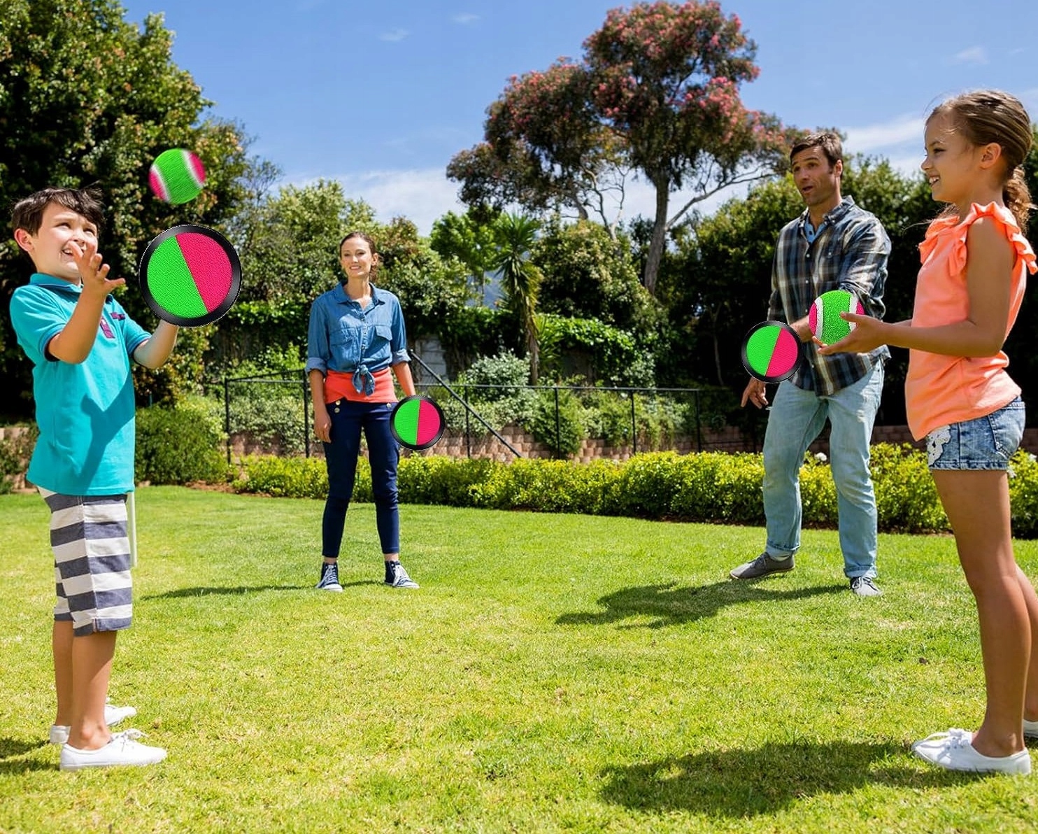 Игра рекомендует бросить мяч, в то время как другой человек ловит его на своей тарелке, покрытой липучкой. Весла прикреплены эластичной лентой, благодаря которой легко адаптировать их к размеру руки.