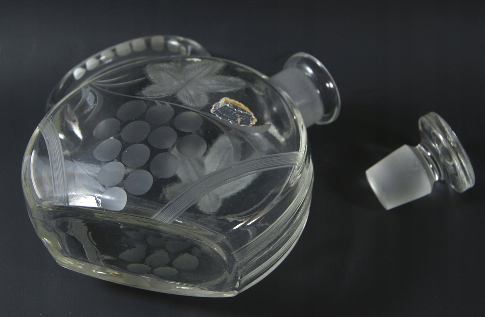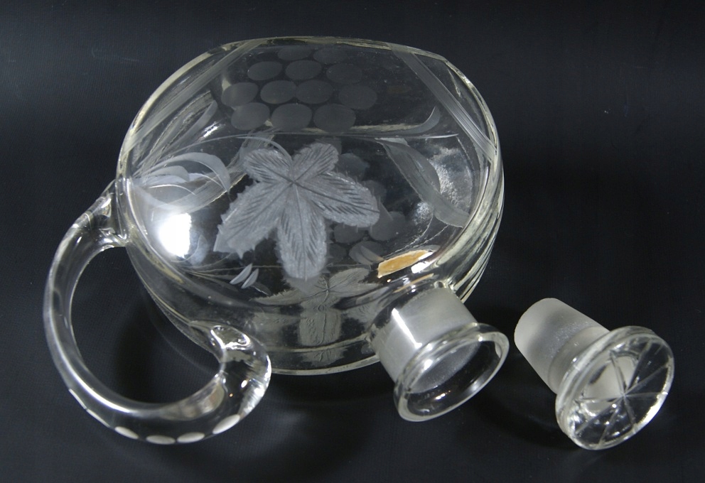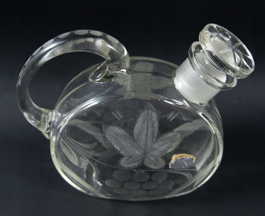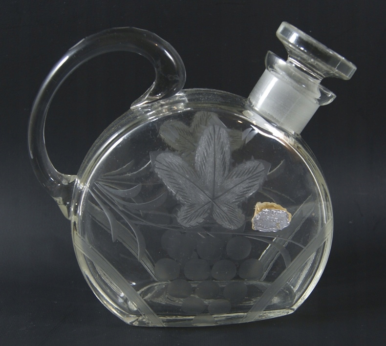Красивый, старый графин изготовлен из бесцветного хрустального стекла, полного пробки. Формула земля с обеих сторон и на ручке.