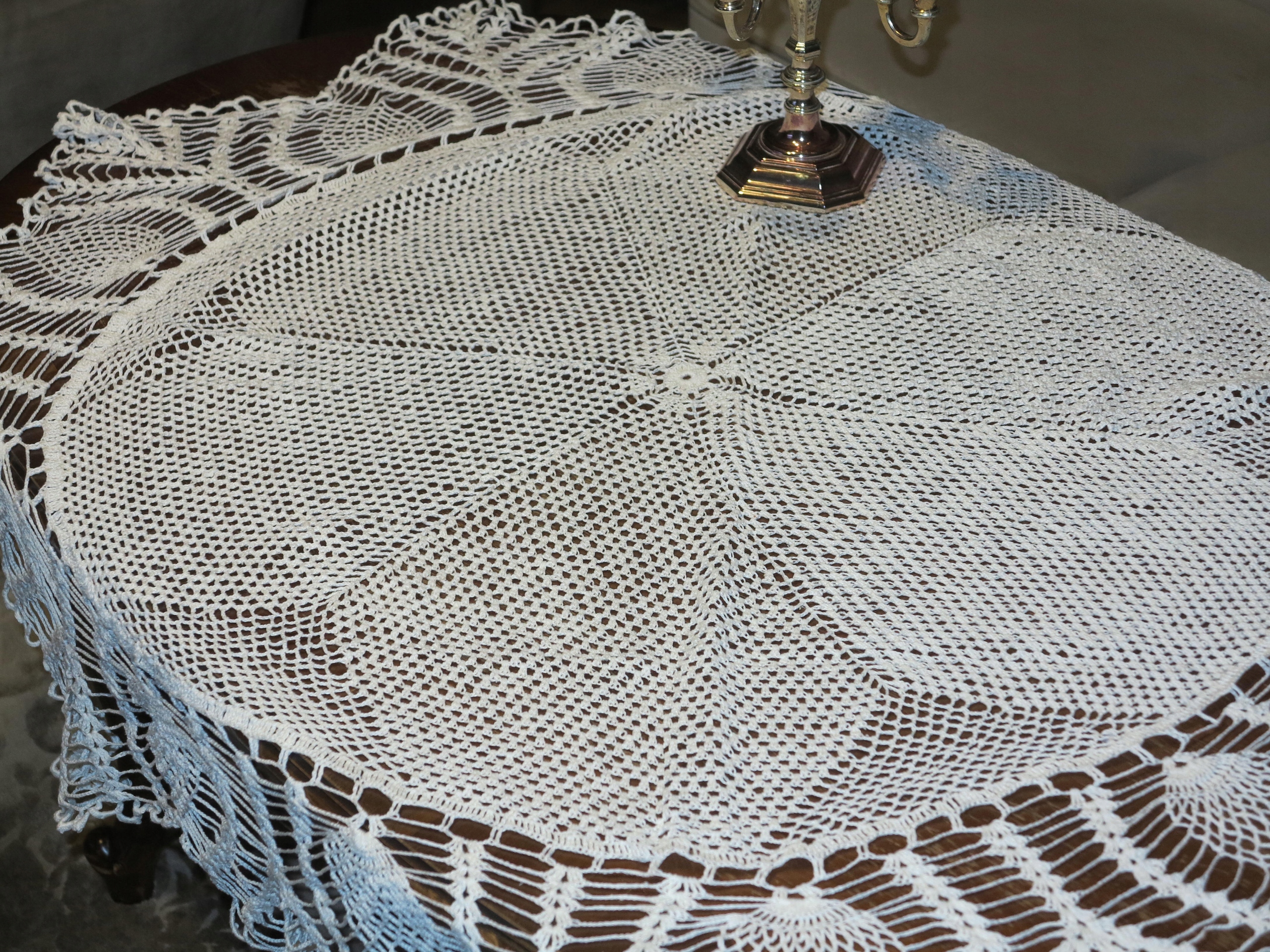 Субъект аукциона представляет собой красивую таблицу, сделанную ручной вязаной клеткой из хлопковых нитей, в запутанном узоре. Это выглядит красиво на столе. Имеет размеры: диаметр: 127 см. Используется в очень хорошем состоянии и качеством. Я рекомендую