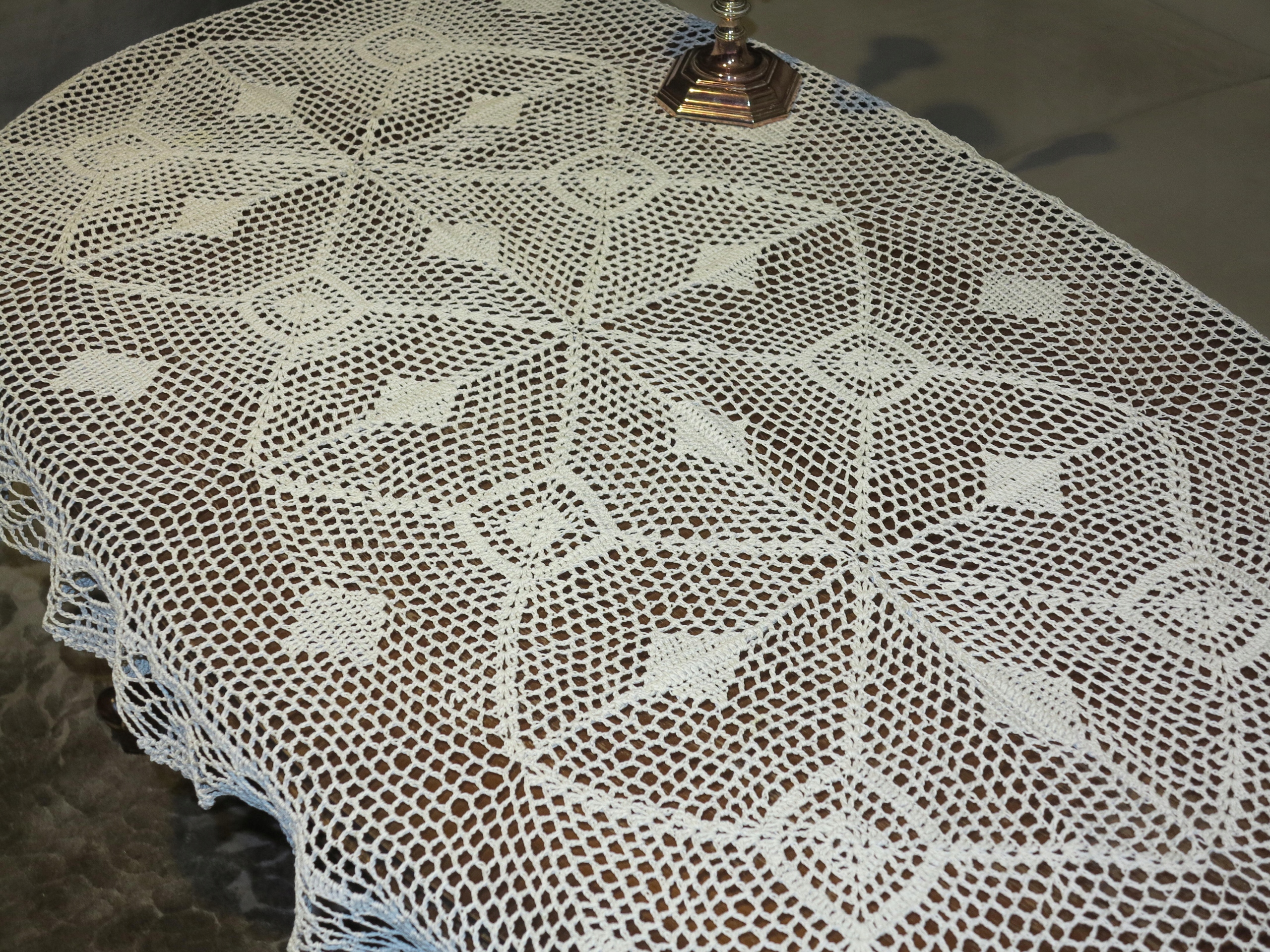 Красивая, вязаная скатерть с более толстыми хлопковыми нитками. Цвет легкого бежевого
