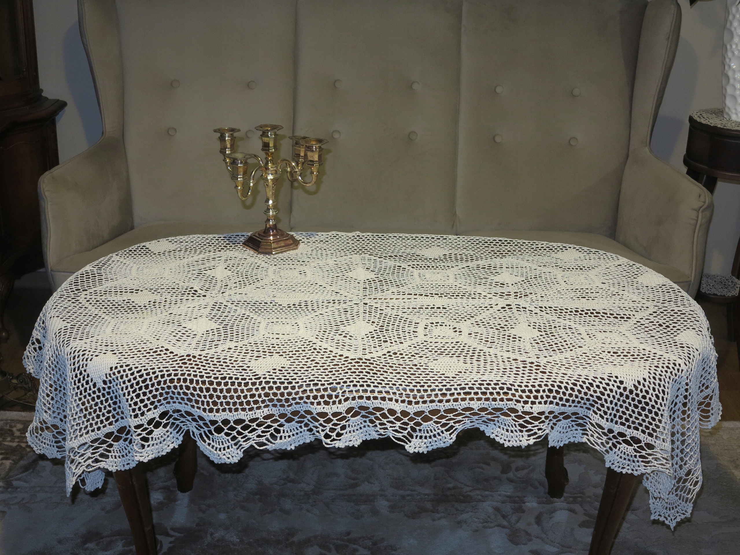 Тема аукциона - красивая, вязаная скатерть в легкой бежевой. Он имеет размеры: 159/95 см. Используется скатерть, в супер хорошем состоянии и качестве. Я рекомендую
