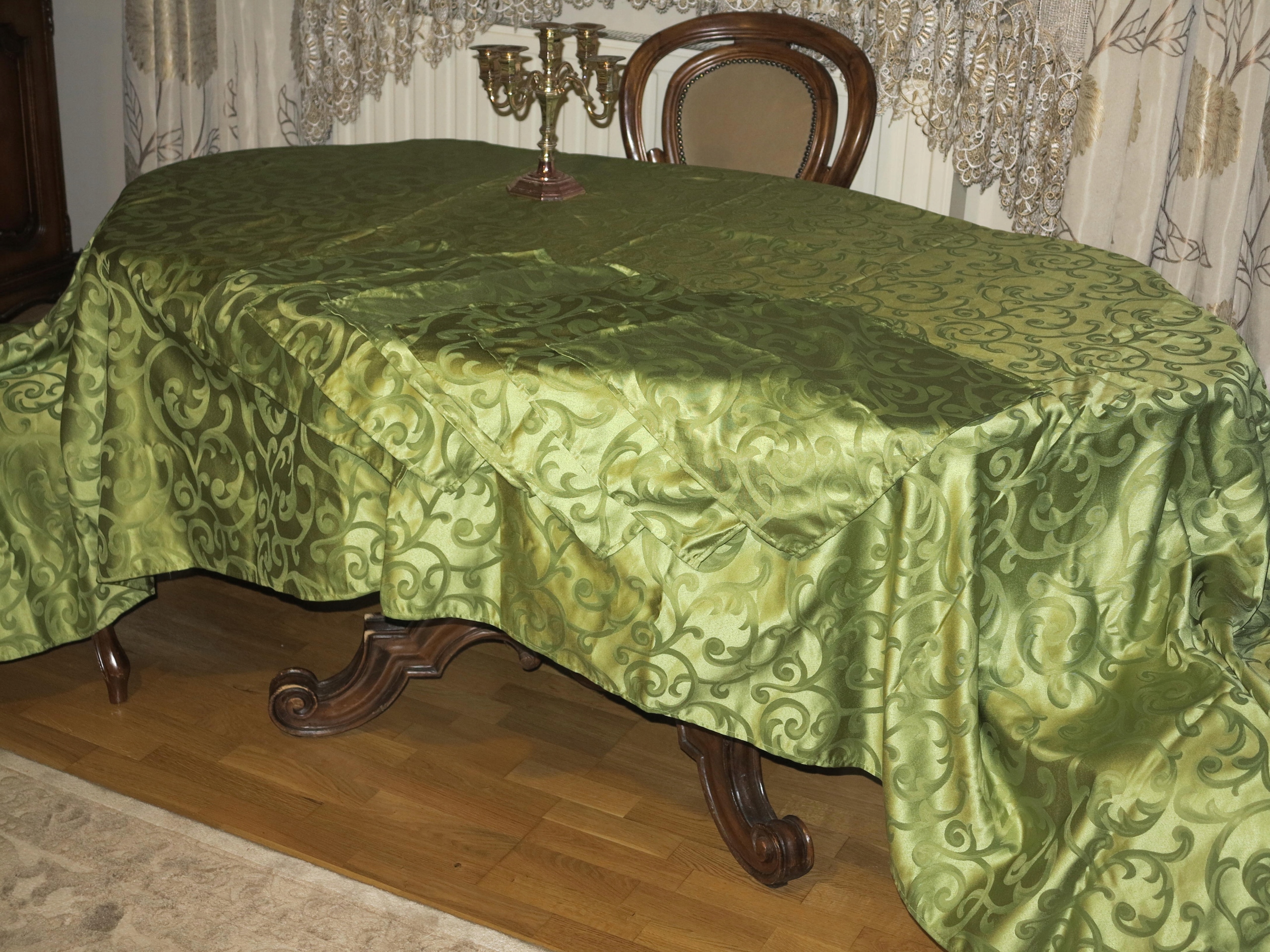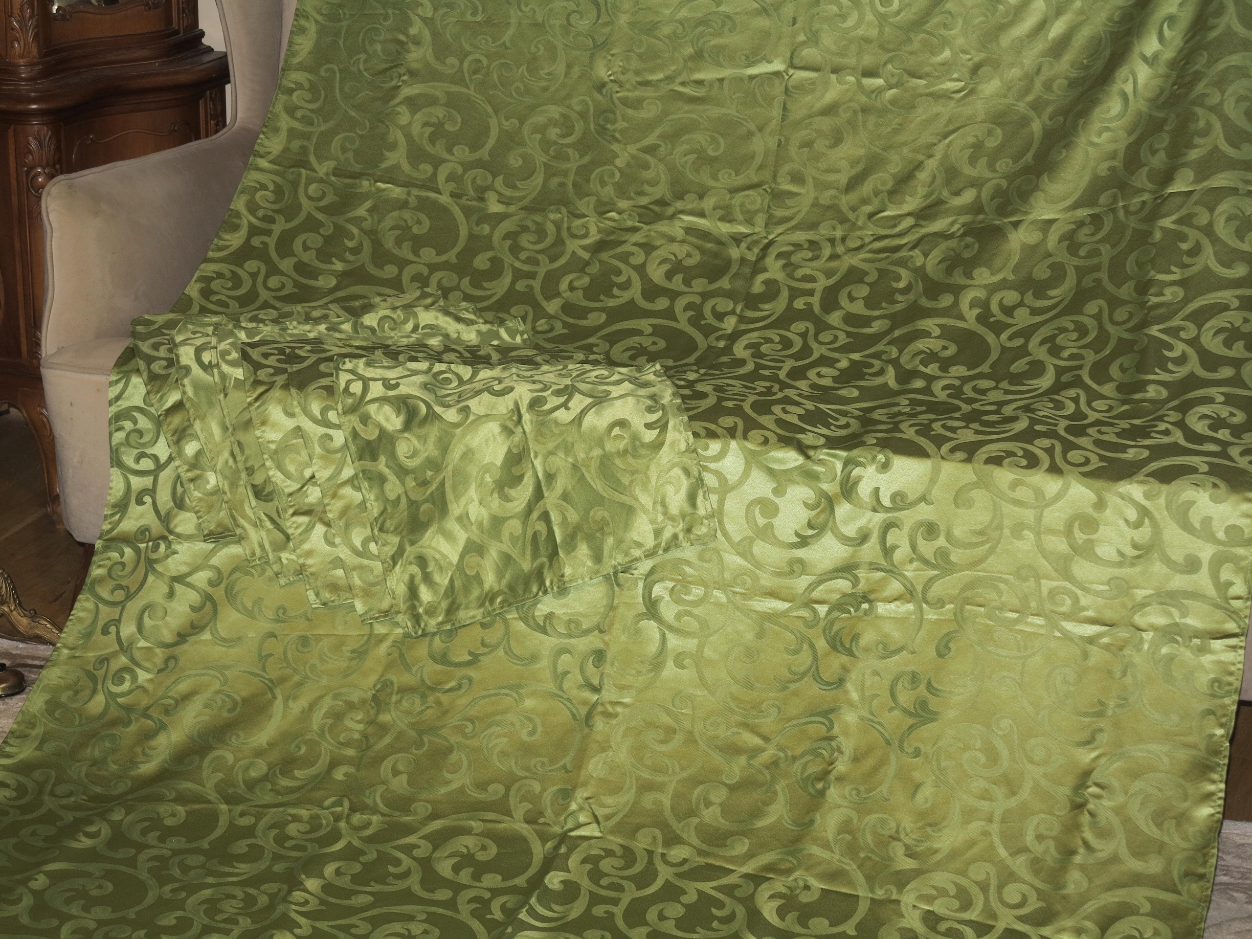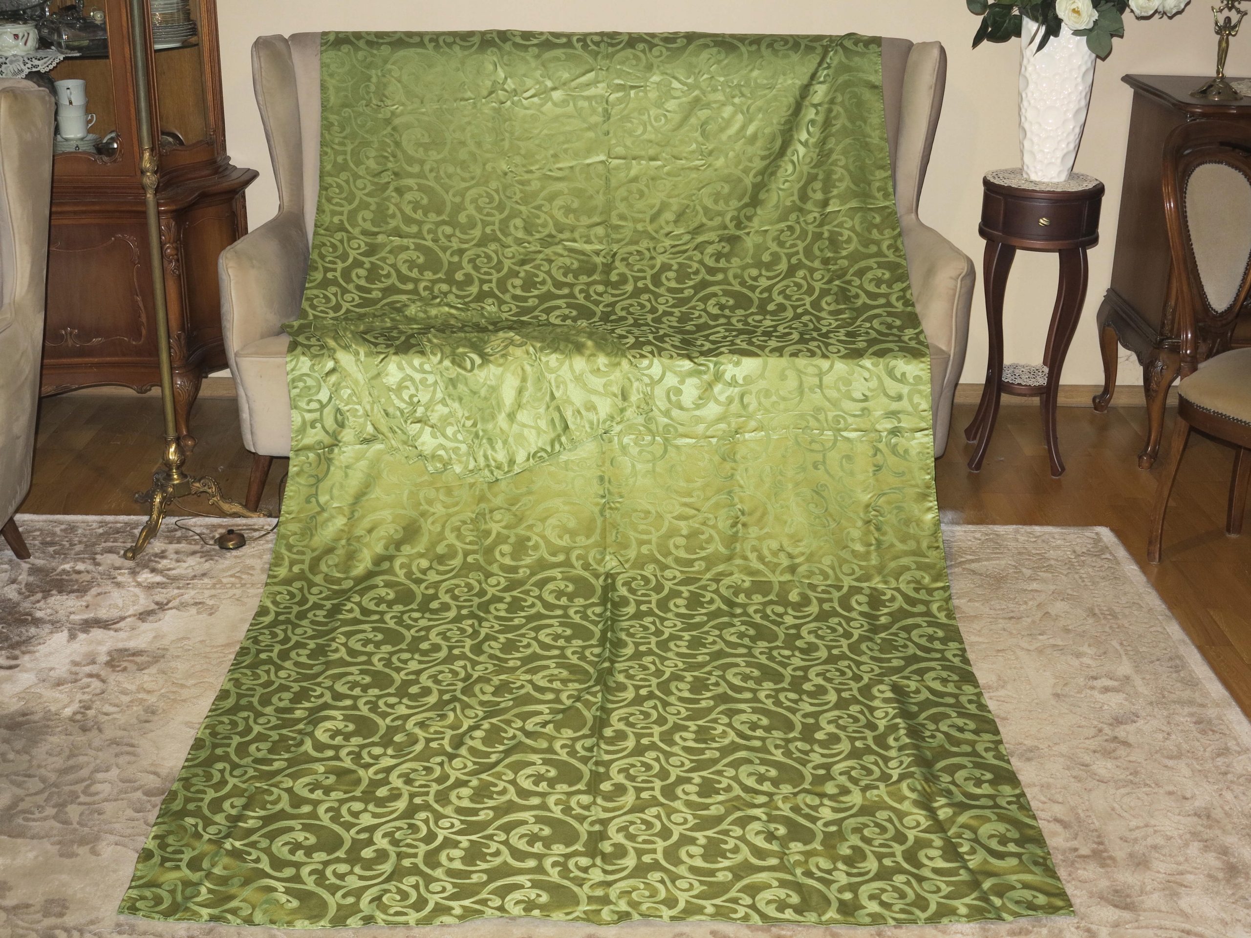 Красивая зеленая огромная скатерть+ 6 салфетка со стильными узорами 295/148