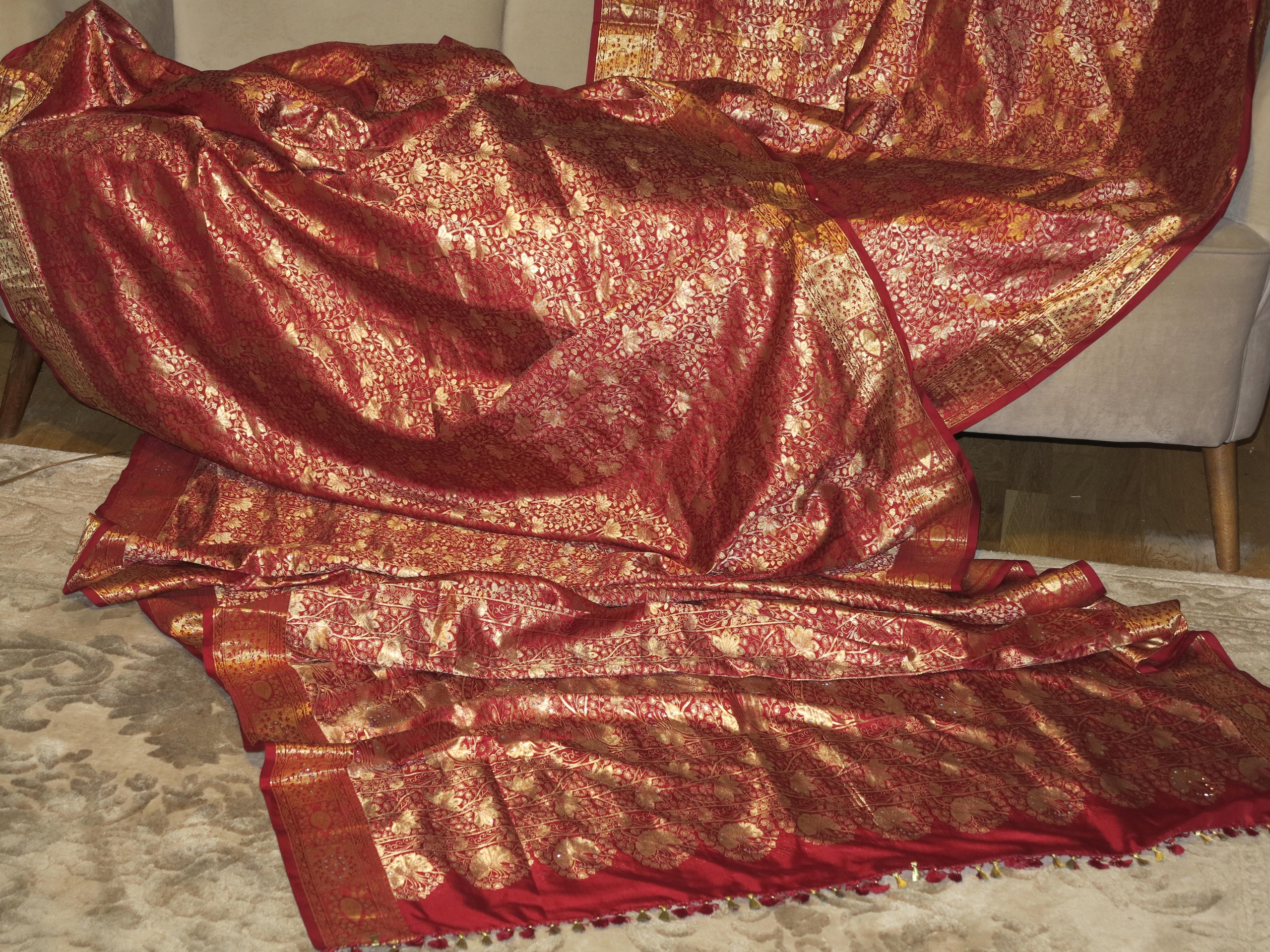 Чрезвычайно красивый двойной сари, декоративная ткань, занавес в BPRDA и золотой колорх. Рыжеволосой кололостики с обеих сторон. С одной стороны (на странице Бордо с золотыми дизайнами) сари украшен застрявшими с хрустальными бусинами.
