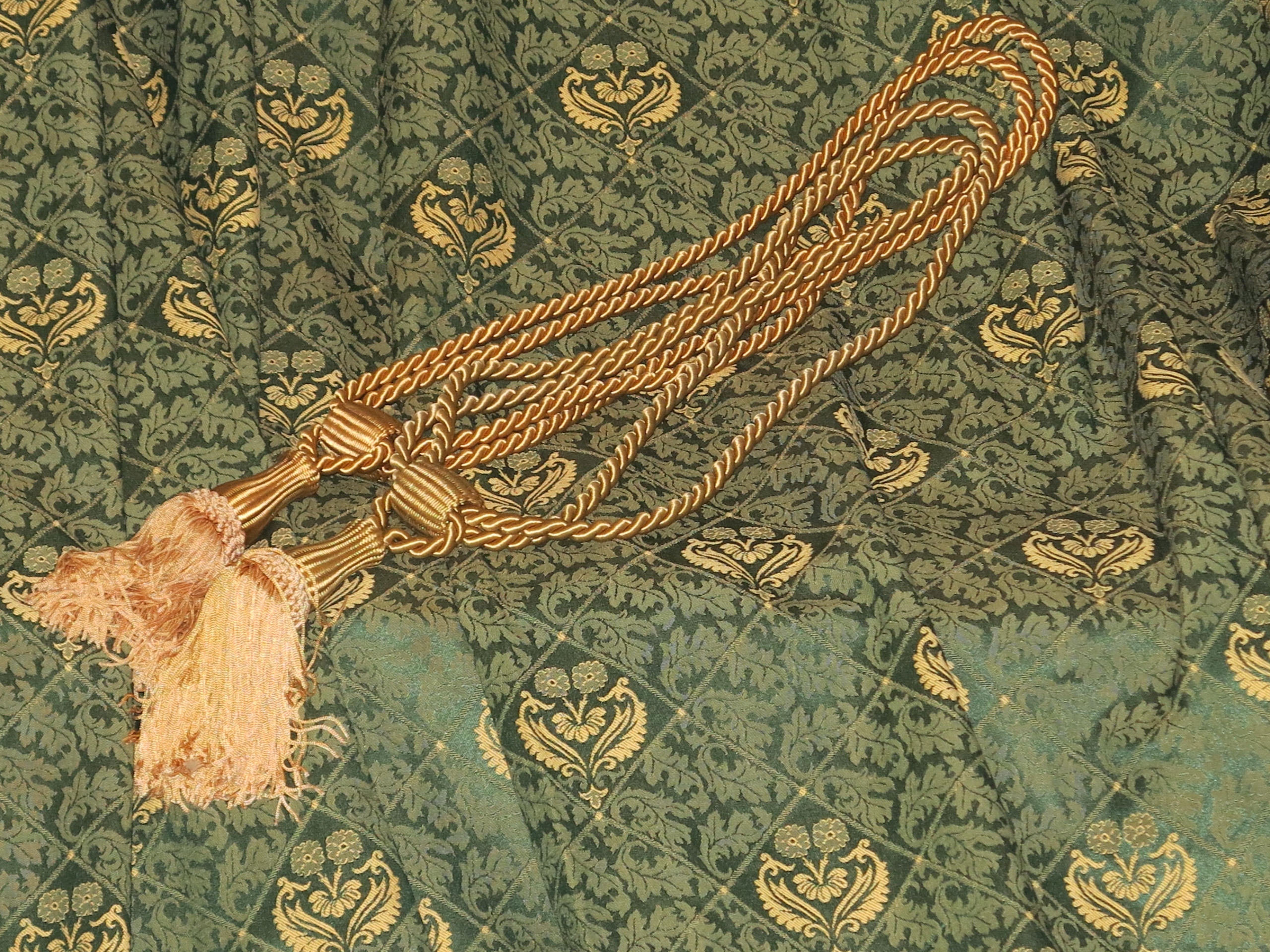 Красивый, английский, набор стильных, широких штор- со стильными золотистыми дизайнами. В композиции золотые шнуры с шелковыми шторами, видимыми на изображениях