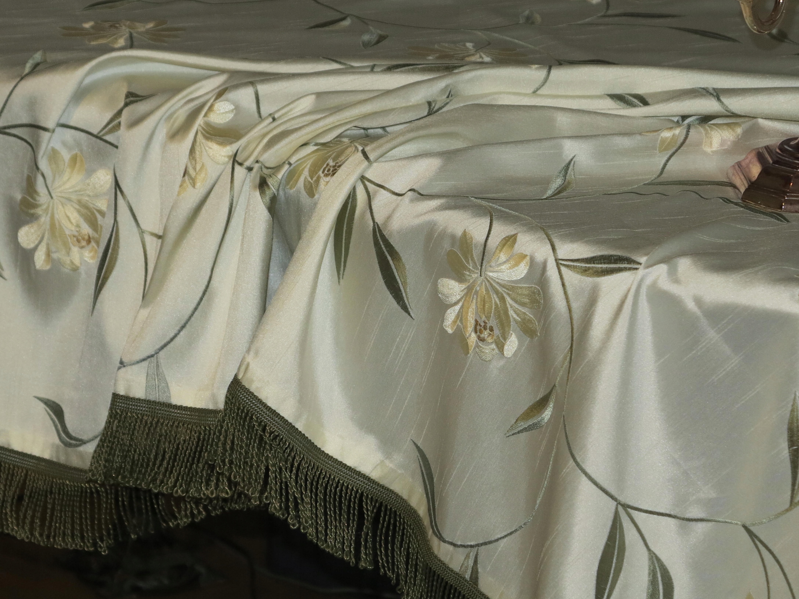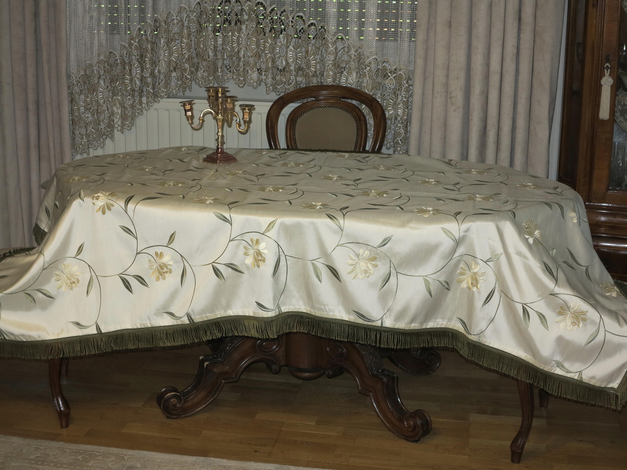 красивую скатерть, сделанную из высококачественного, твердого искусственного шелка в переливаемом экру, все в вышитых цветах. Приблизительно для зеленых полов