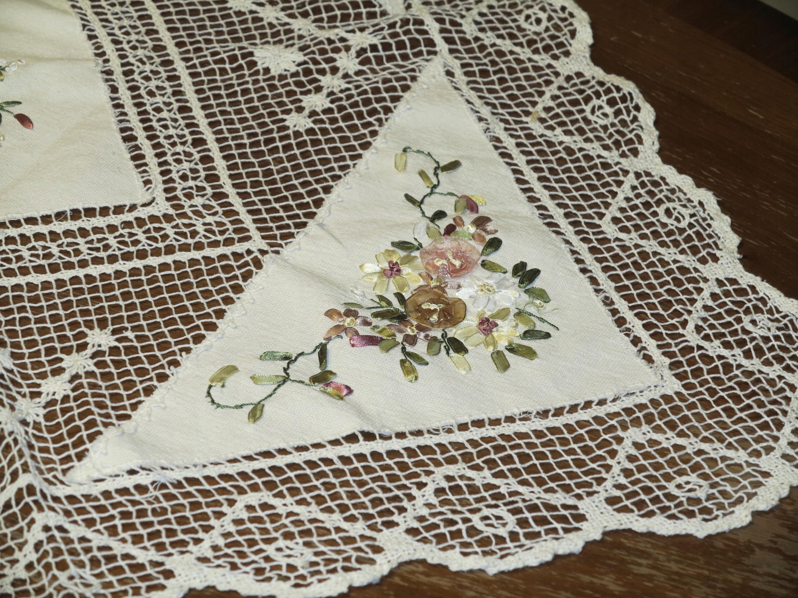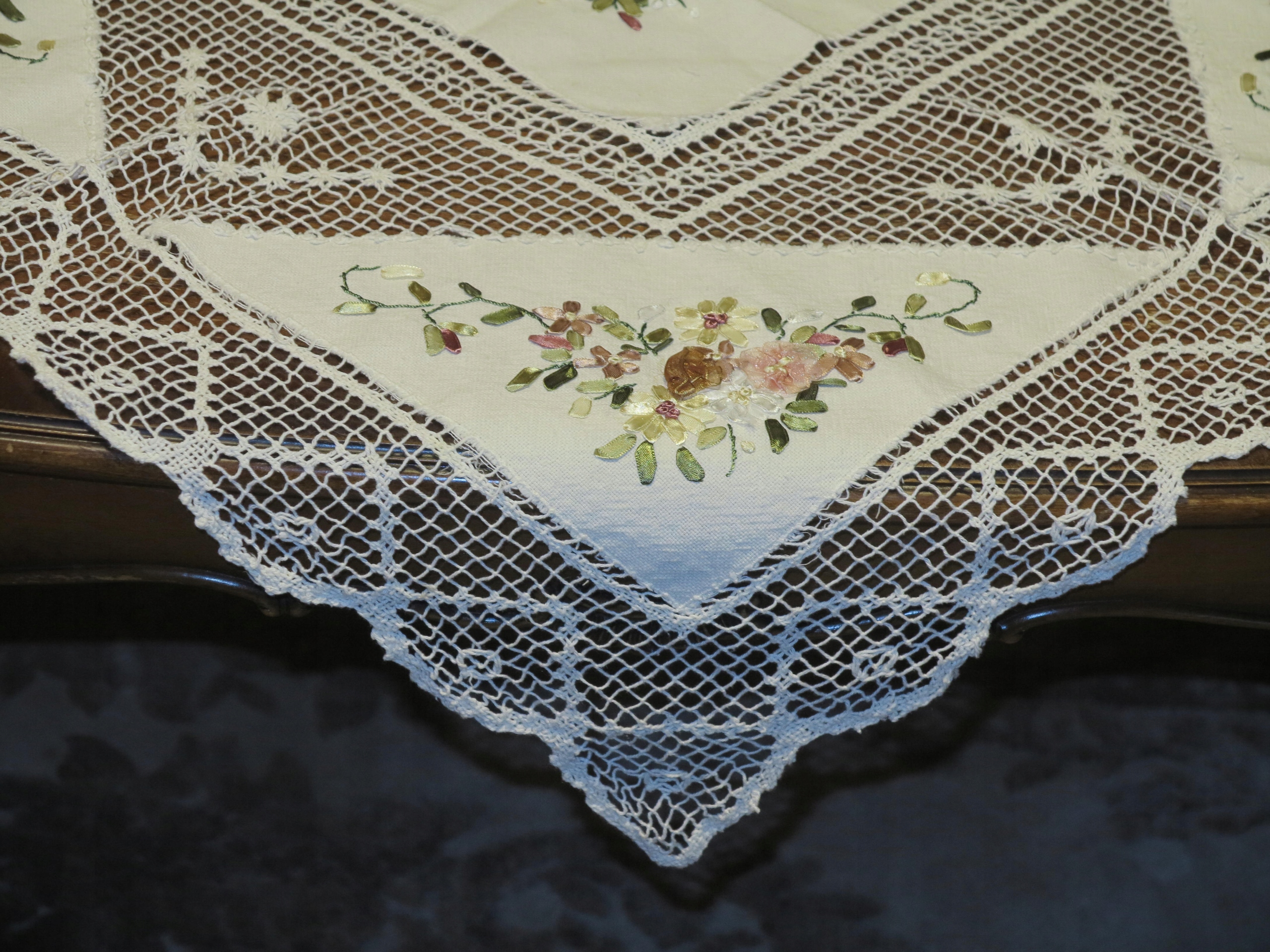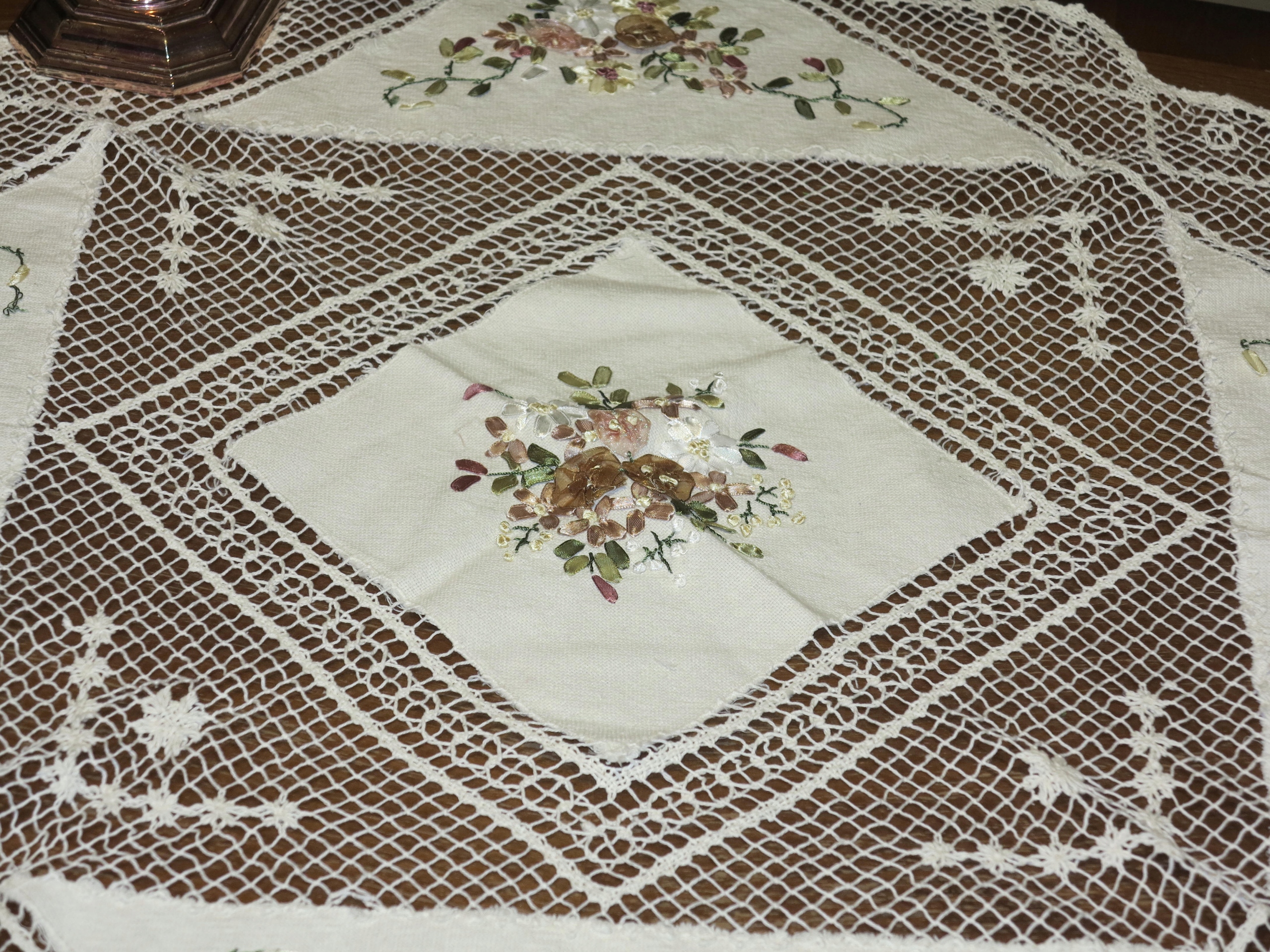 Красивая хлопчатобумажная скатерть- комбинация вставки для колышков + хлопковое полотно, украшенное ленточным червем. Есть красивая скатерть, сочетание холста и дюбеля, с вышивкой ленточной чертой, выглядит красиво на столе. Он имеет размеры: 80/77 см. Используется в супер хорошем состоянии. Я рекомендую