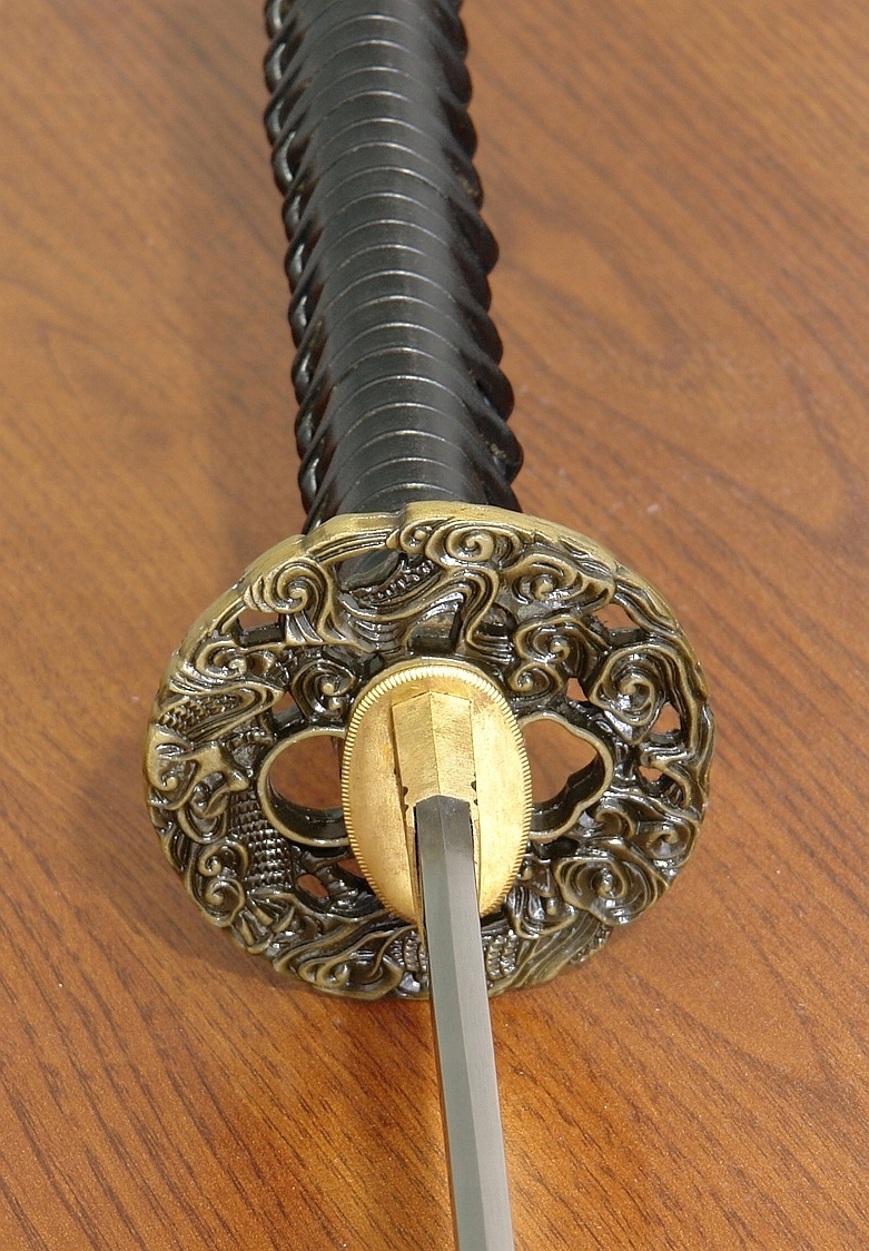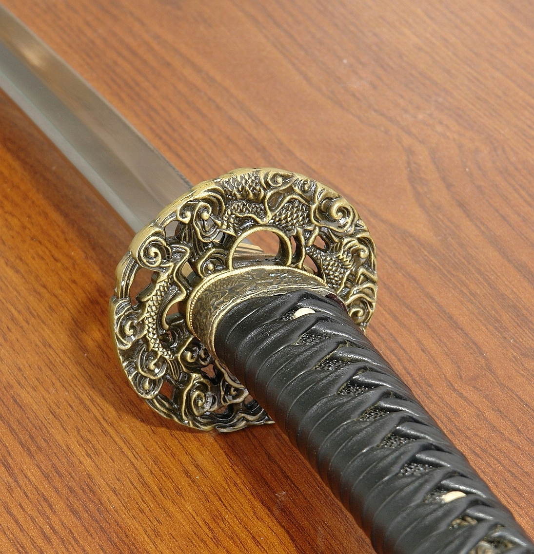 - Цевье (хабаки), цуба (гарда) с мотивом дракона морского цвета, две менуки и шайбы (сеппа) из латунного сплава - как на фото.