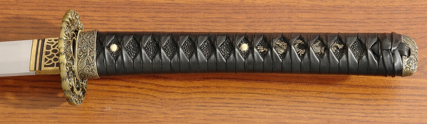 - деревянная рукоять (цука) обтянута черной кожей ската (саме-гава), оплетка из плотно натянутой кожи.