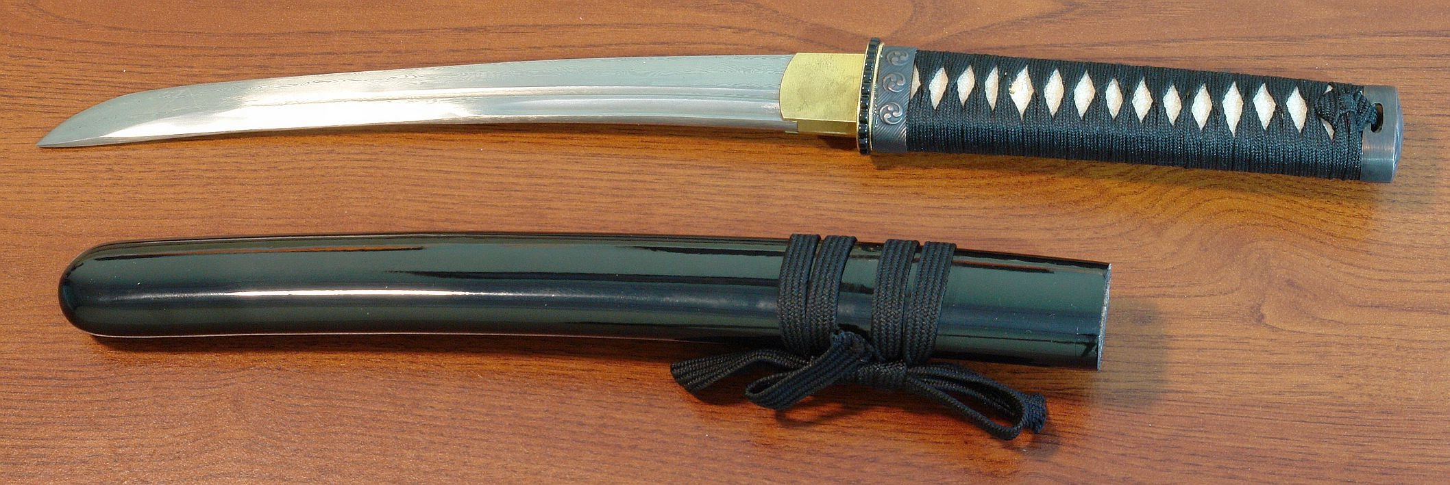 - деревянная ручка (цука), покрытая кожаными лучами (само-займа), косы (tsuka ito) черный хлопок