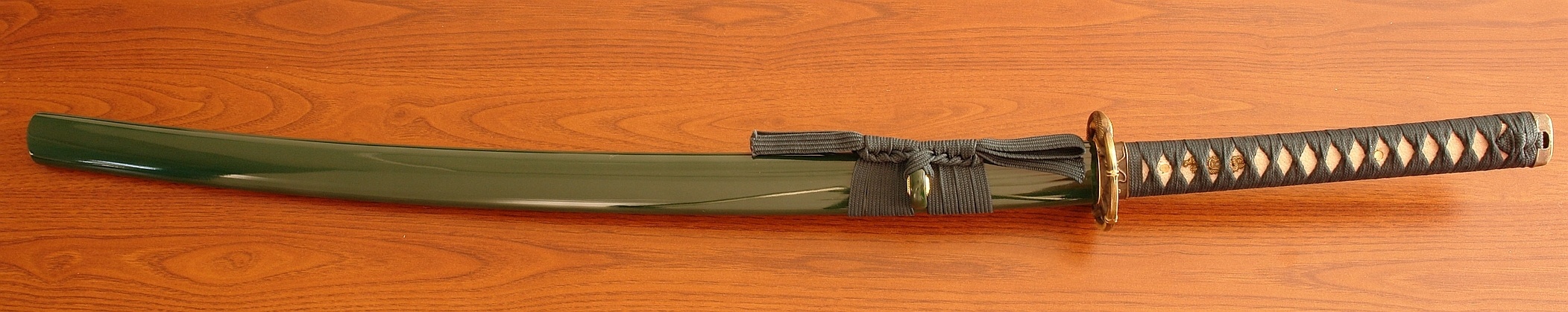 - влагалище (Saya) деревянный лак с темно -зеленым блеском (бутылочный зеленый, гнилый зеленый), темно -зеленый шелк Segeo (Rayon) со временными латуни Посмотрите красиво. Геометрия, идеально подходящая для обучения /p>
