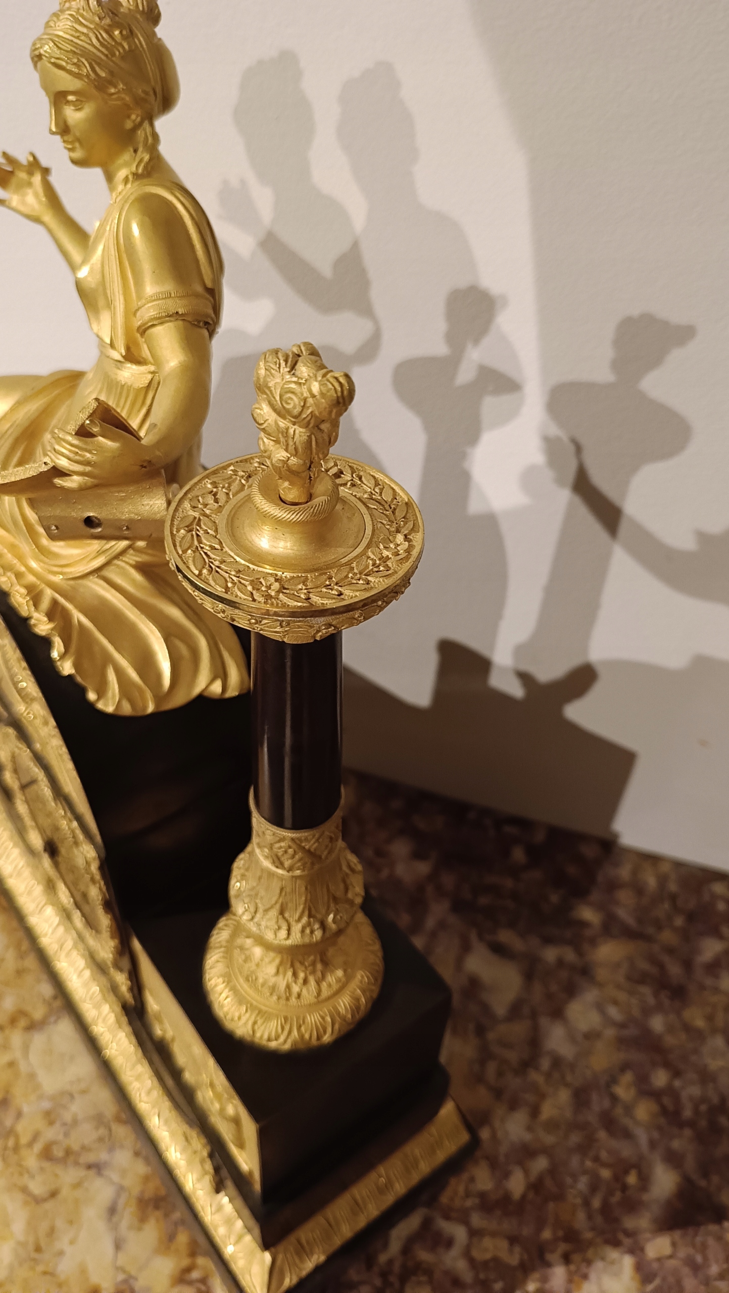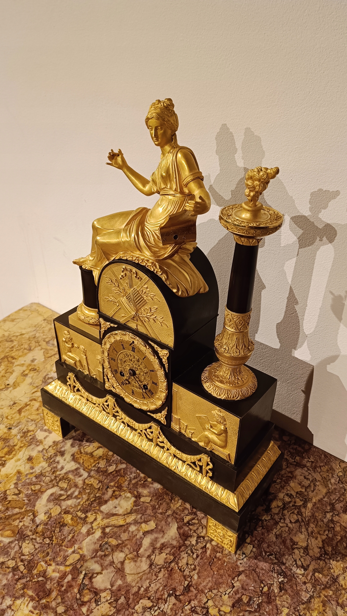 Позолоченный. Бронзовый механизм, циферблат в очень хорошем состоянии. Книга, которую держит женщина, взята из других часов. В комплект входят маятник и ключ.