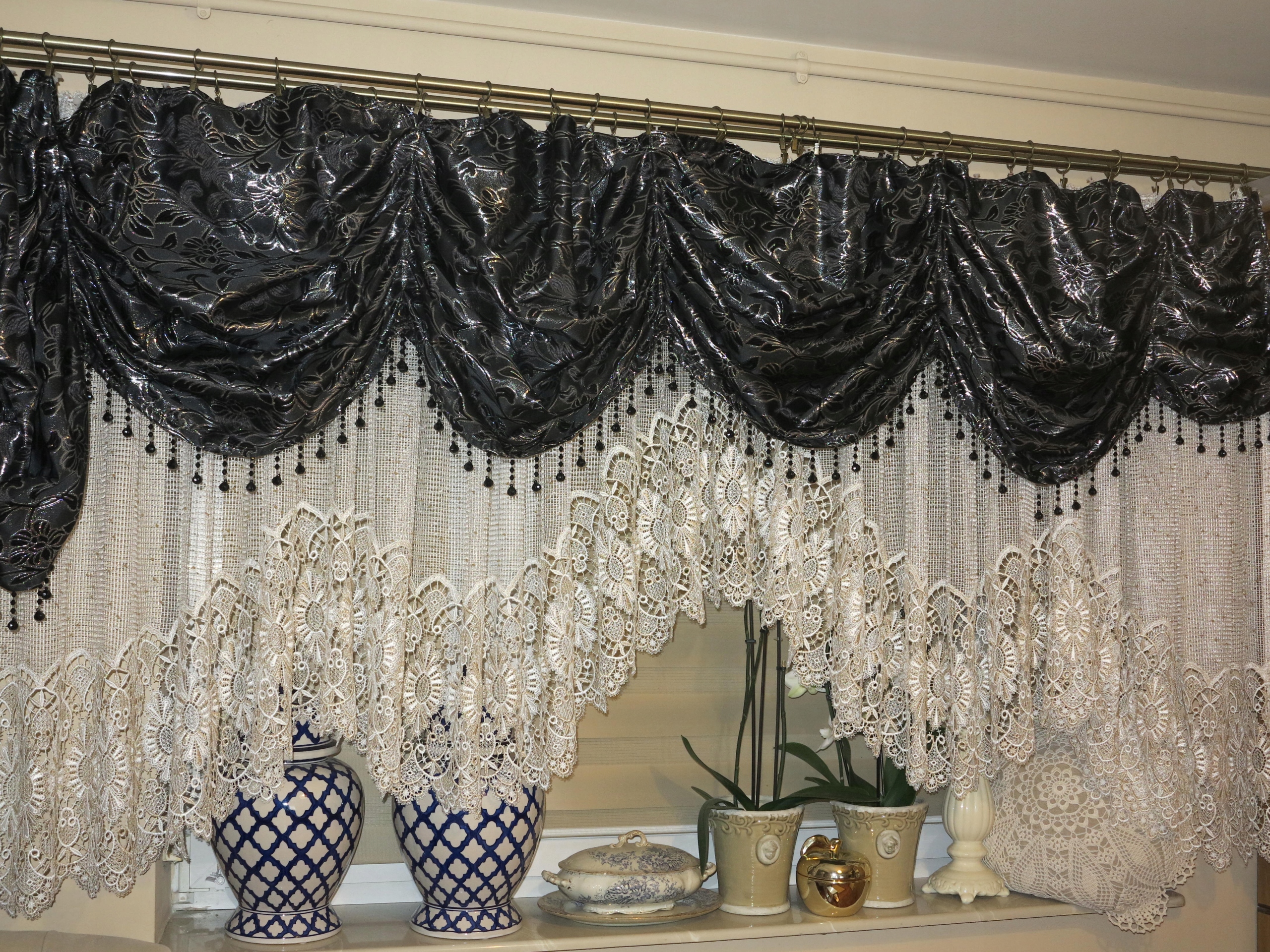 КРАСИВЫЙ ЧЕРНЫЙ ЛАМБРЕКЕН С СЕРЕБРЯНЫМИ УЗОРАМИ. ДНО УКРАШЕНО СВИСЯЩИМИ КОРАЛЛАМИ. ЗАФИКСИРОВАНО ВВЕРХУ, ШИРИНА НЕ РЕГУЛИРУЕТСЯ. НА ФОТО ОН ПОДВЕШЕН НЕМНОГО ТУГО ИЗ-ЗА СЛИШКОМ КОРОТКОГО КАРДИНА.