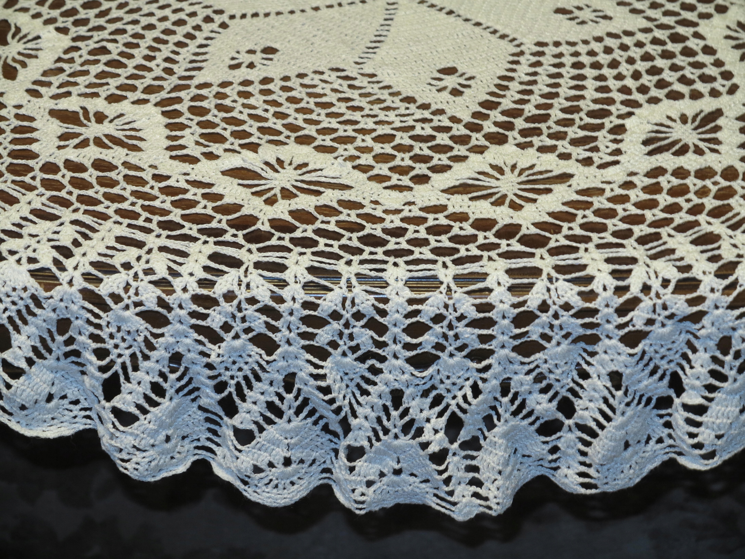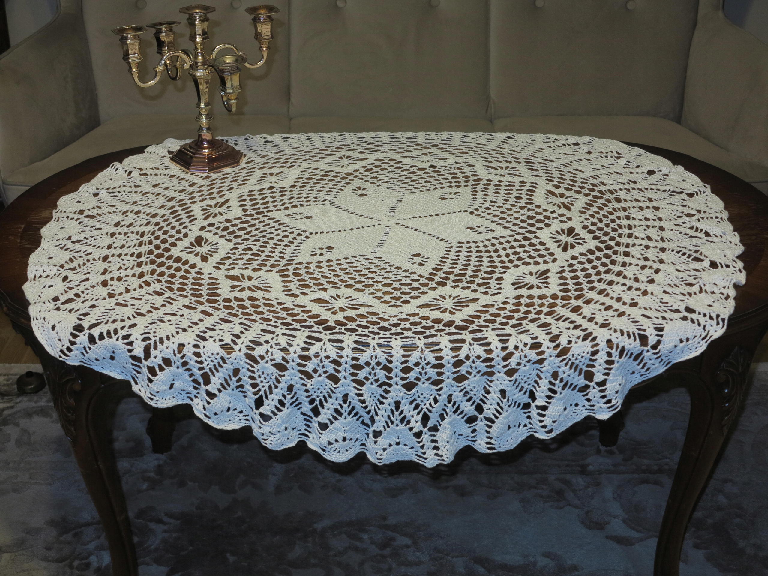 Тема аукциона - красивая скатерть, сделанная вручную в схеме вязания крючком. Это выглядит красиво на столе. Имеет размеры: диаметр: 108 см. Используется, в супер хорошем состоянии и качество. Я рекомендую.