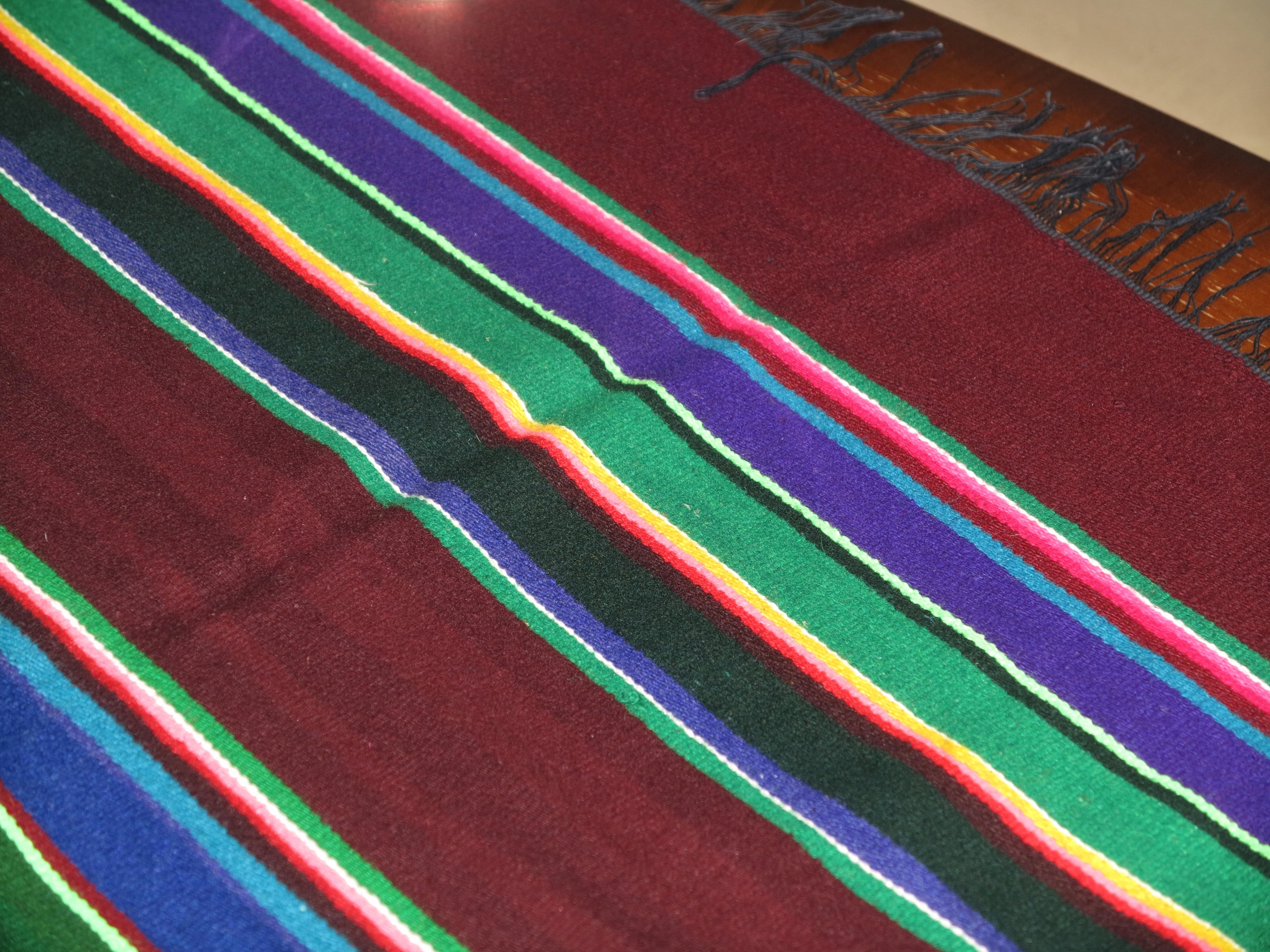 ВЕКОВУЮ КРАСИВУЮ НАРОДНУЮ ШЕРСТЯНУЮ СКАТЕРТЬ ИЛИ КИЛИМ, ТЕМНО-КОРИЧНЕВЫЙ ФОН (с бордовым оттенком), РАДУЖНЫЕ ПОЛОСКИ. БАХКА ПО ДЛИННЫМ СТОРОНАМ