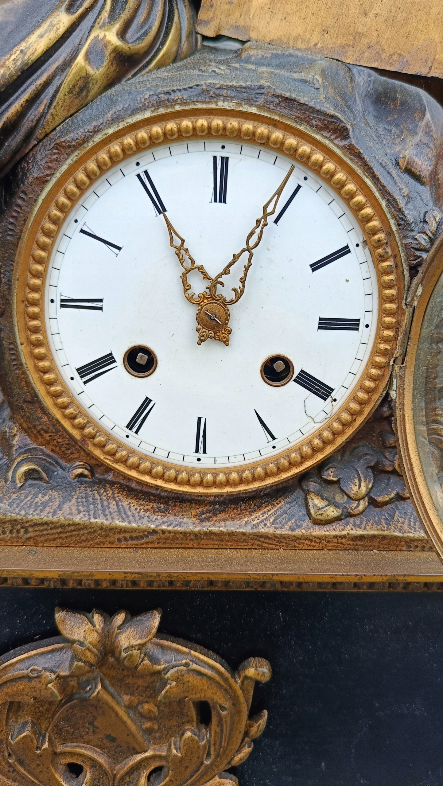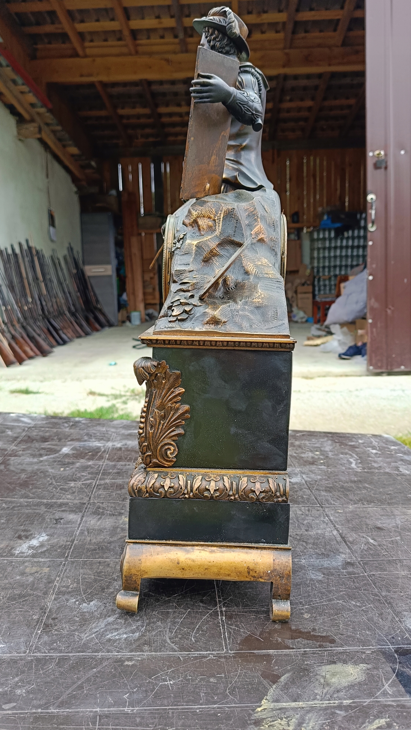 Часы, сделанные из бронзы и мрамора. Механизм функционален, завершается в очень хорошем состоянии, разрывает часы с полчаса. Щит изумрутного механизма в очень хорошем состоянии. Ключевой маятник.