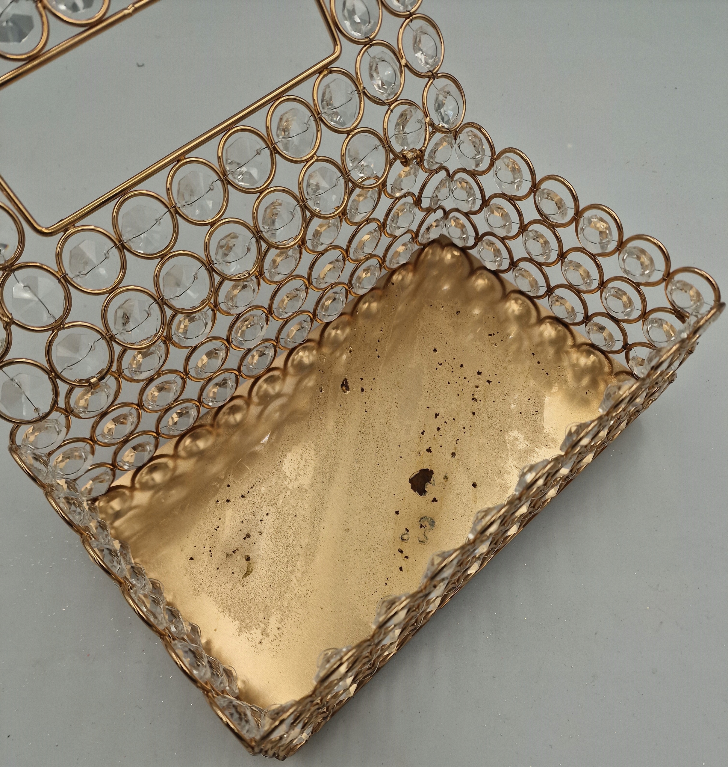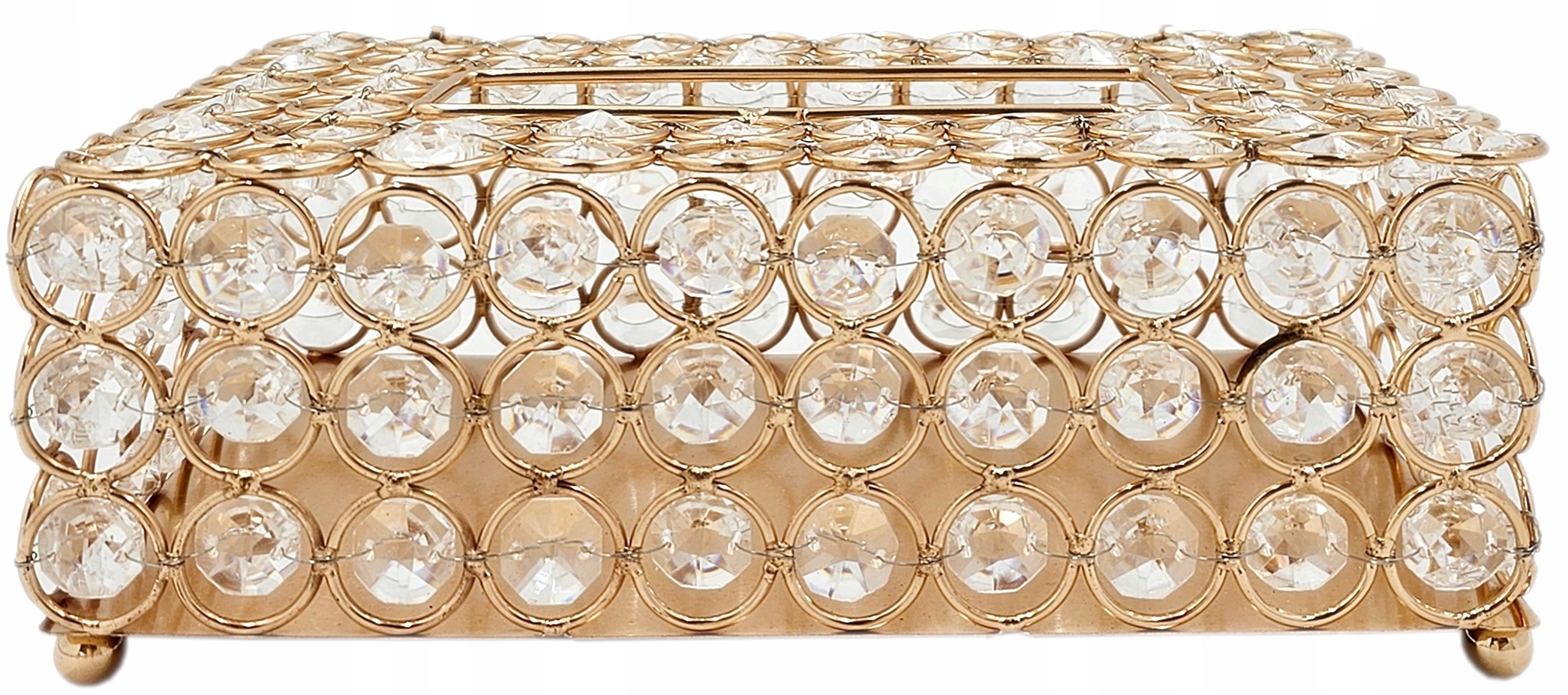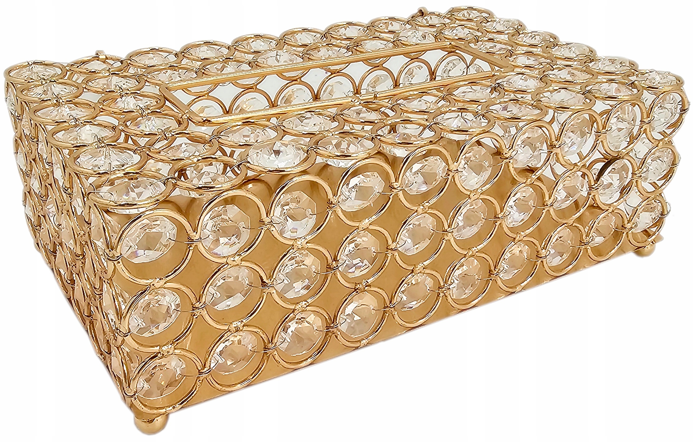 коробка для тканей с кристаллами по бокам, а также верхнее отношение. Нижняя часть контейнера - металлическая, отделанная четырьмя круглыми подборами. Отверстие в форме прямоугольника.