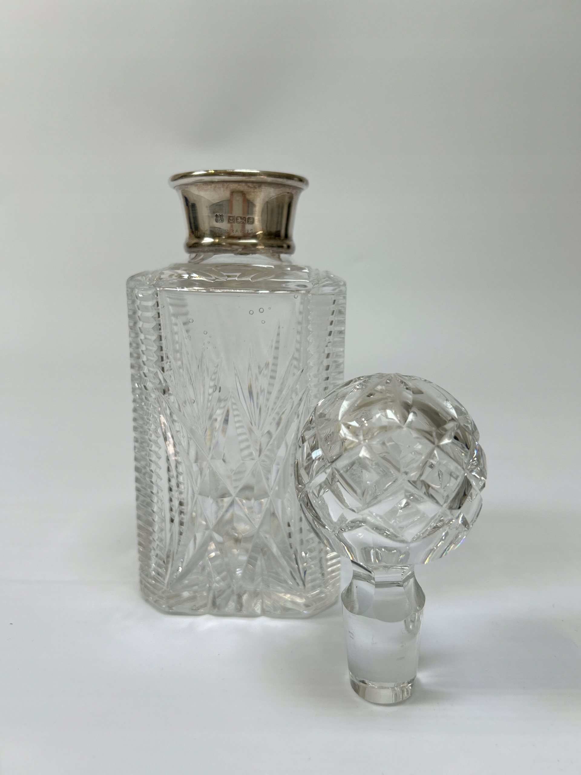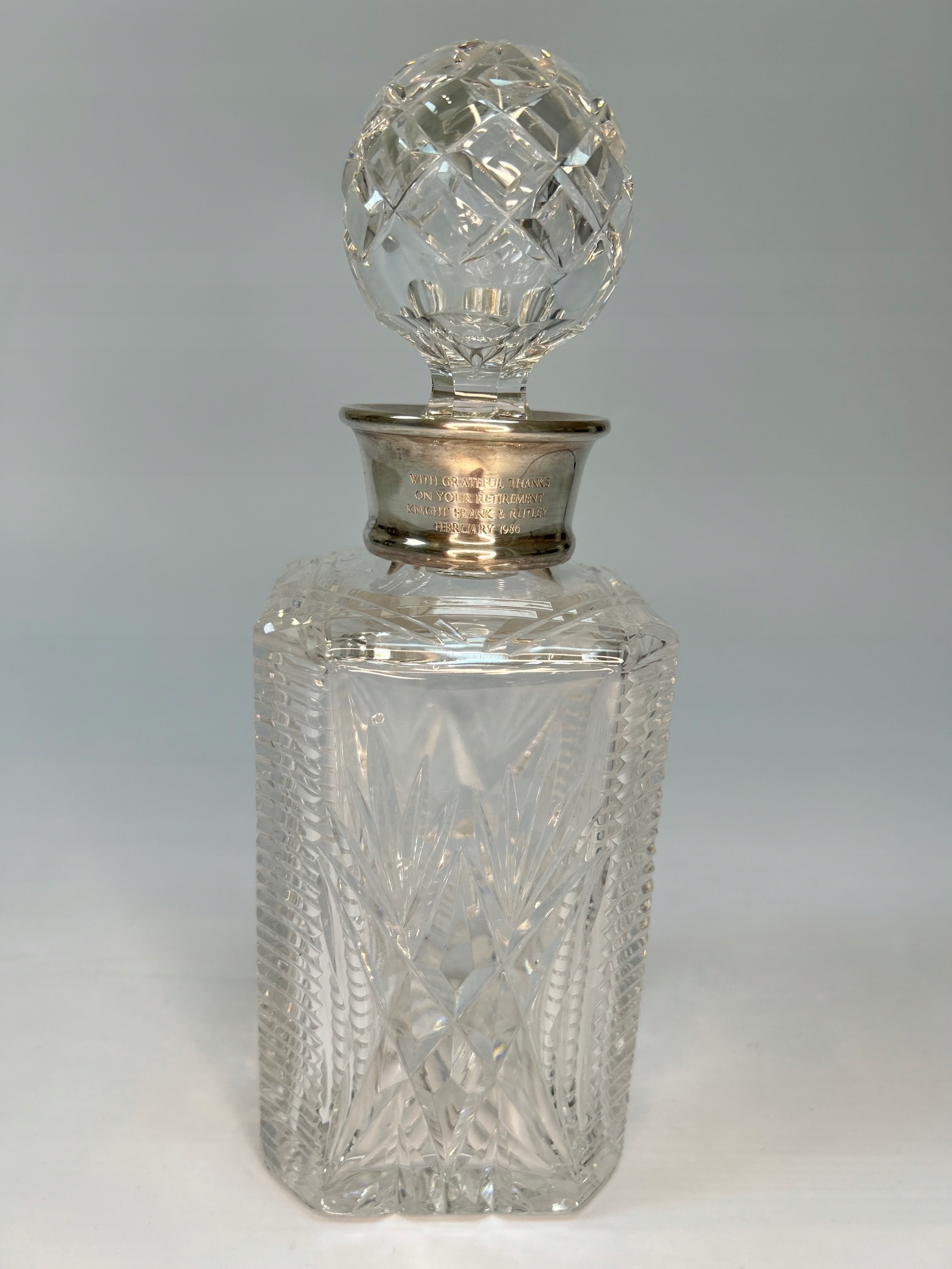 Представляю вам хрустальный графин для виски с декоративной огранкой и красивой декоративной пробкой. Шея посеребренная, на ней видна гравировка с датой и благодарностью.