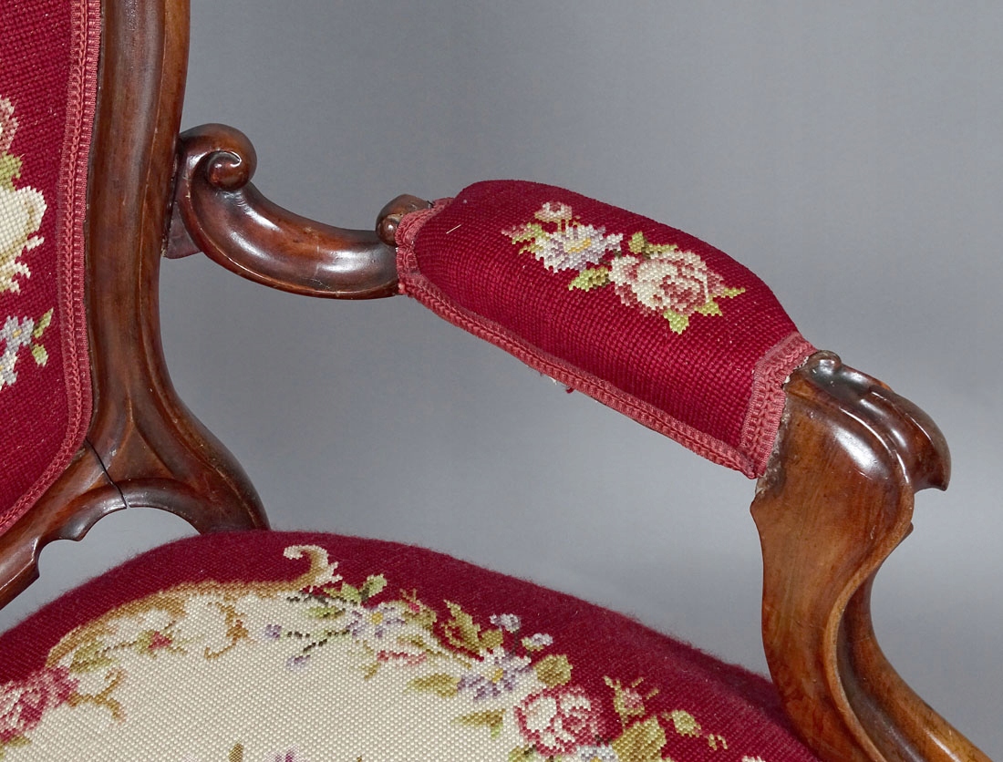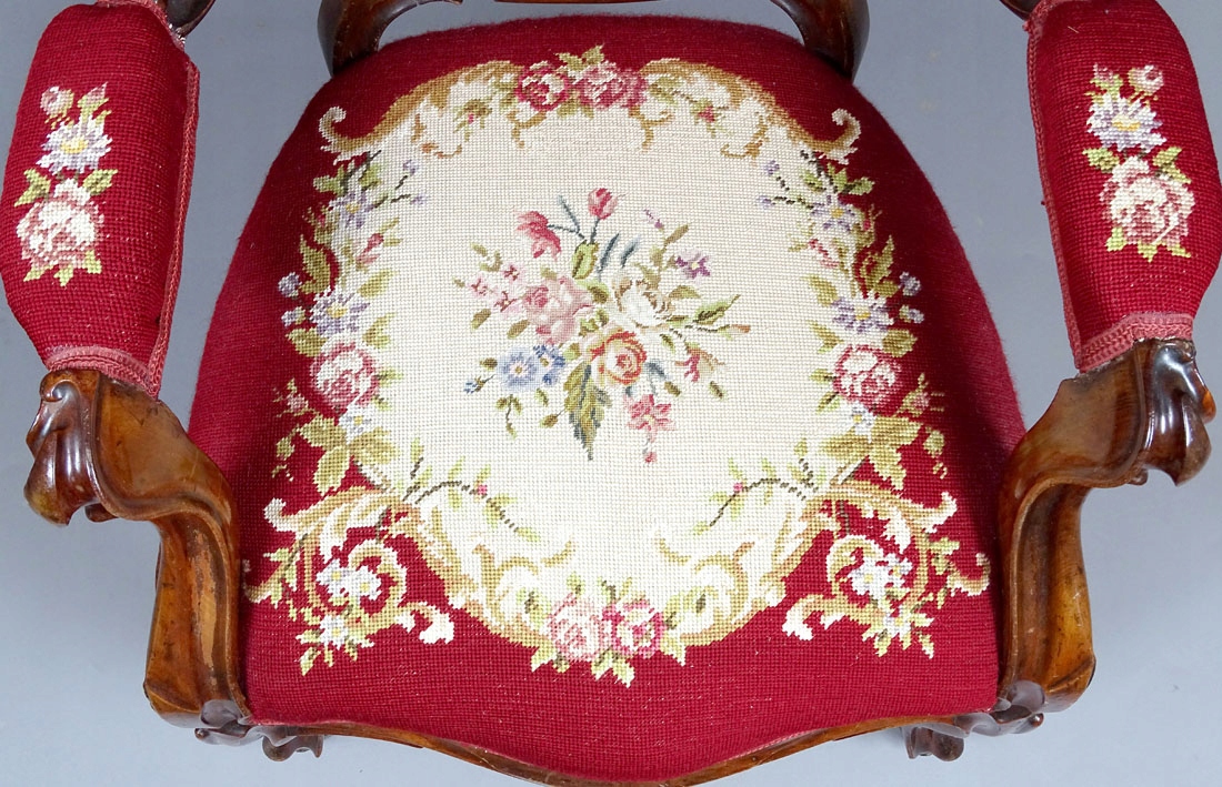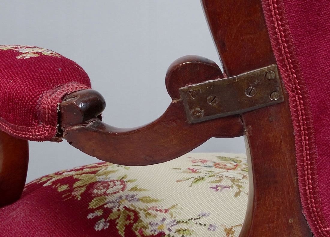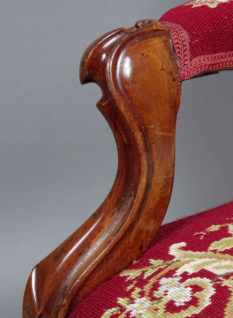 с изогнутыми линиями каркаса, с обивкой на сиденье и спинке, а также частично на опорах. Опирается на четыре ножки, передние сигмовидные ножки, резные на конце с латунными роликами, задние изогнуты, повернуты, сужены внизу. Спинка слегка откинута назад профилированной ажурной планкой вверху, соединенной с изогнутыми подлокотниками, поддерживаемыми резными опорами. Обивка сиденья закреплена на ремнях с пружинами, с более широким и отогнутым передом.