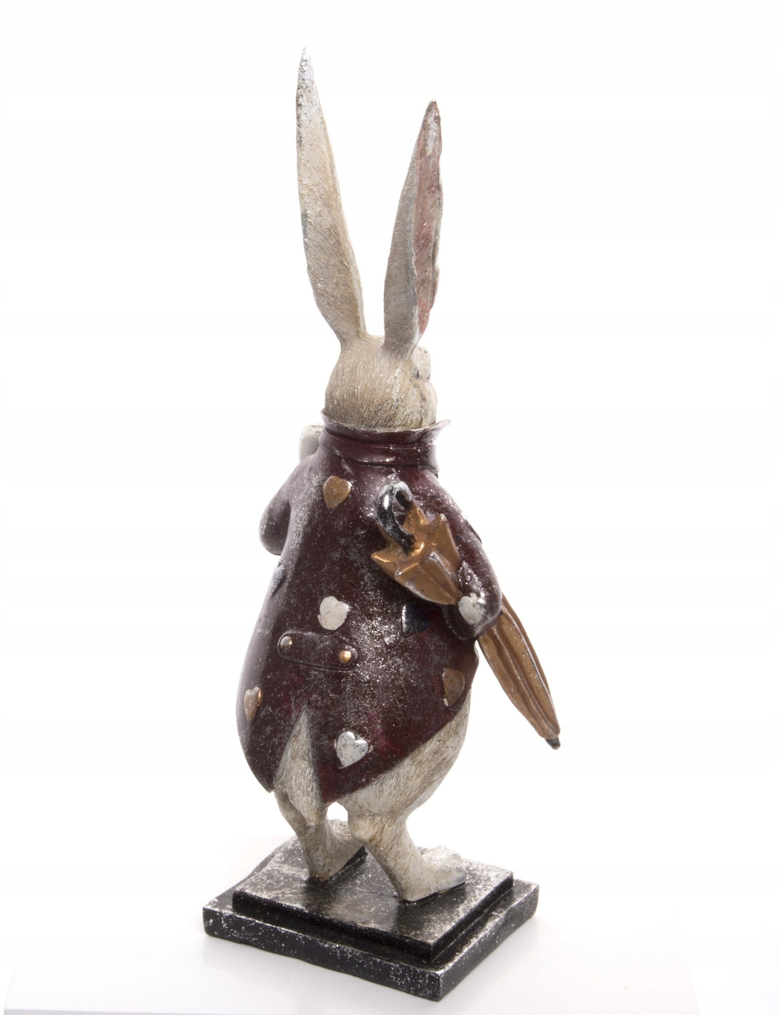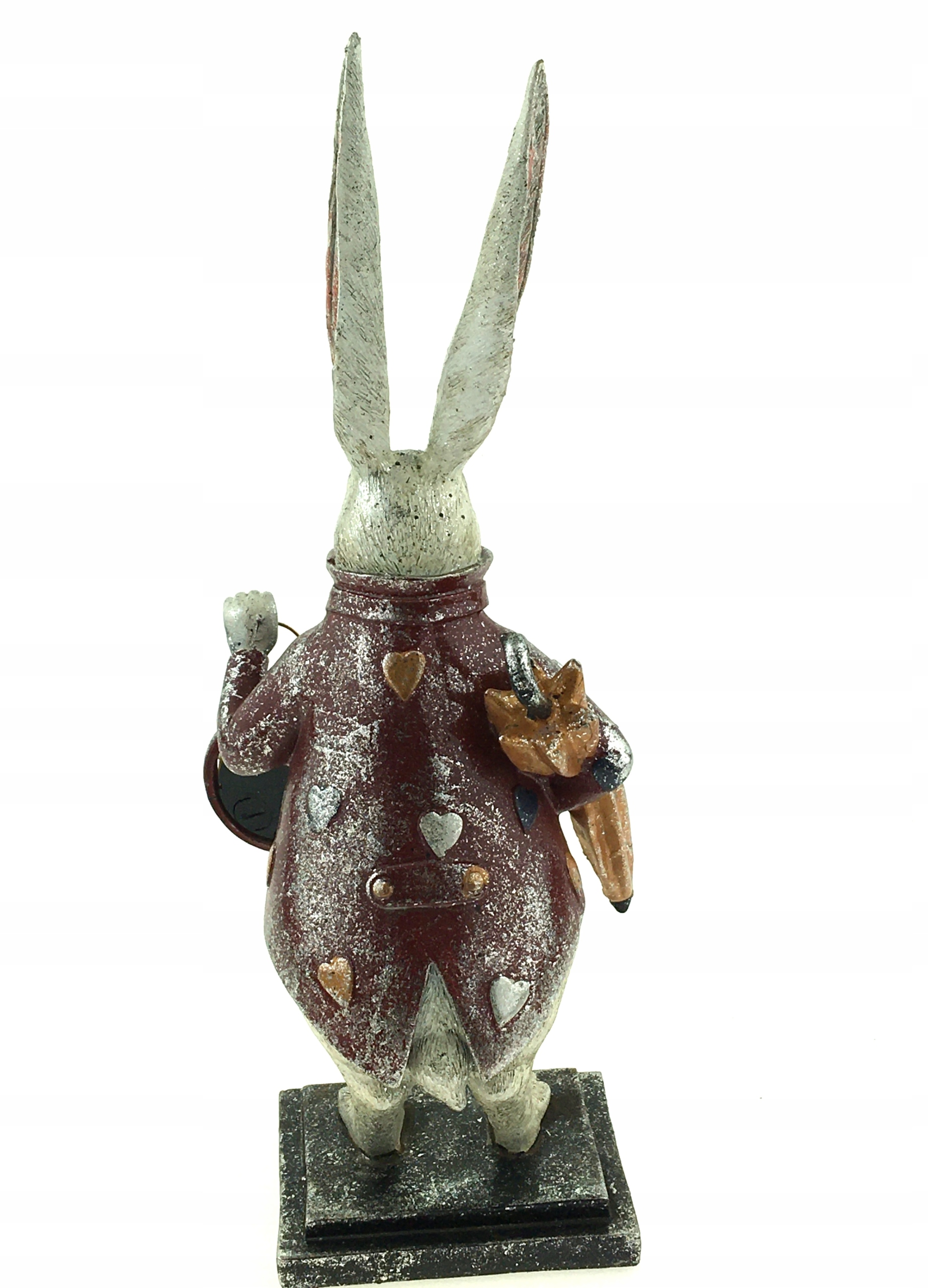элегантная, большая статуэтка кролика с часами, вдохновленная романом Алисы в стране чудес. Статуэтка, сделанная из синтетической смолы в легком бежевом, буре, оранжевом и черном, основанная на черном постаменте. Кролик, его одежда и пьедестал имеют серебряные ссадины. Фигурок тяжелая, стабильная, тщательно сделанная.