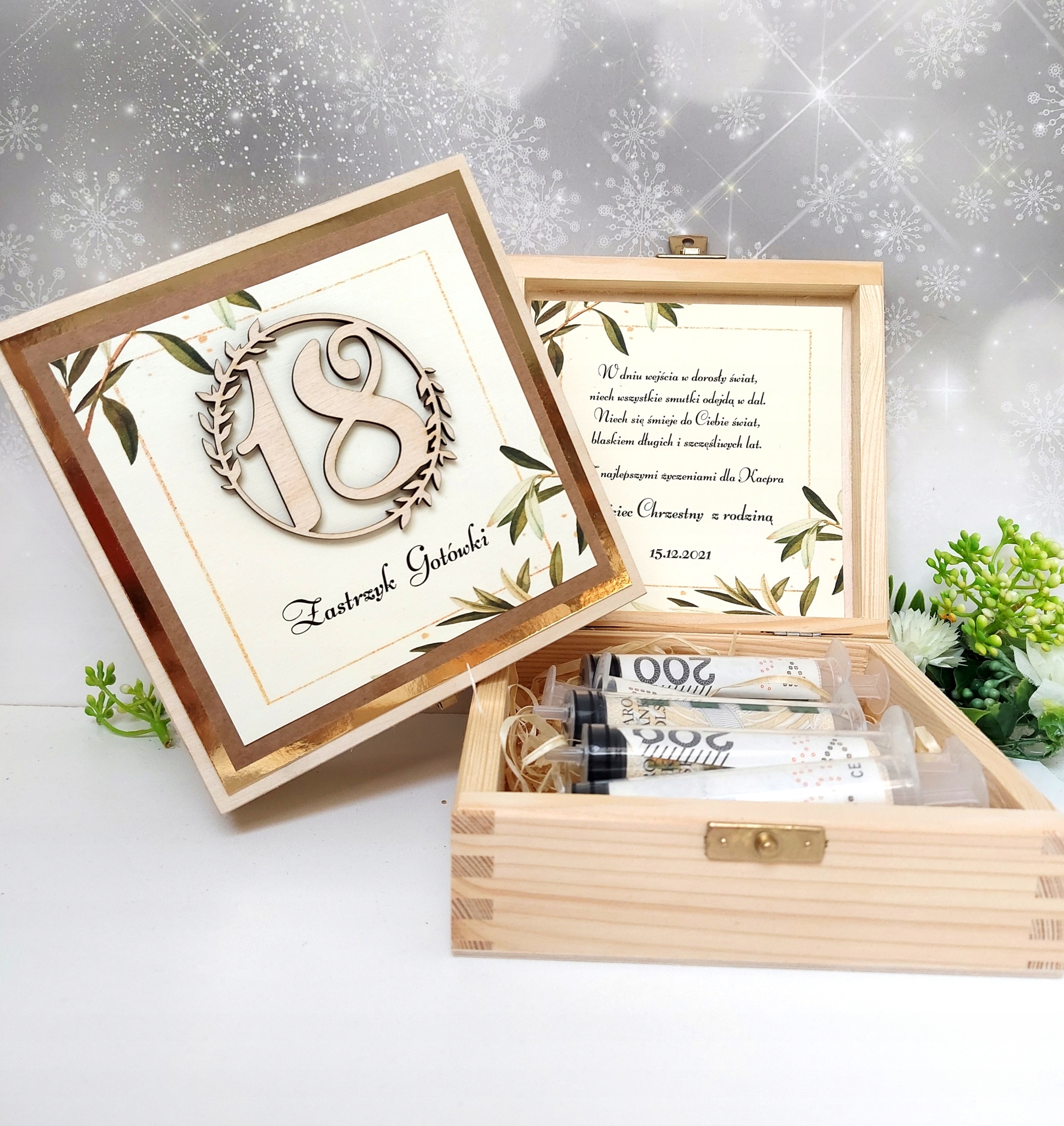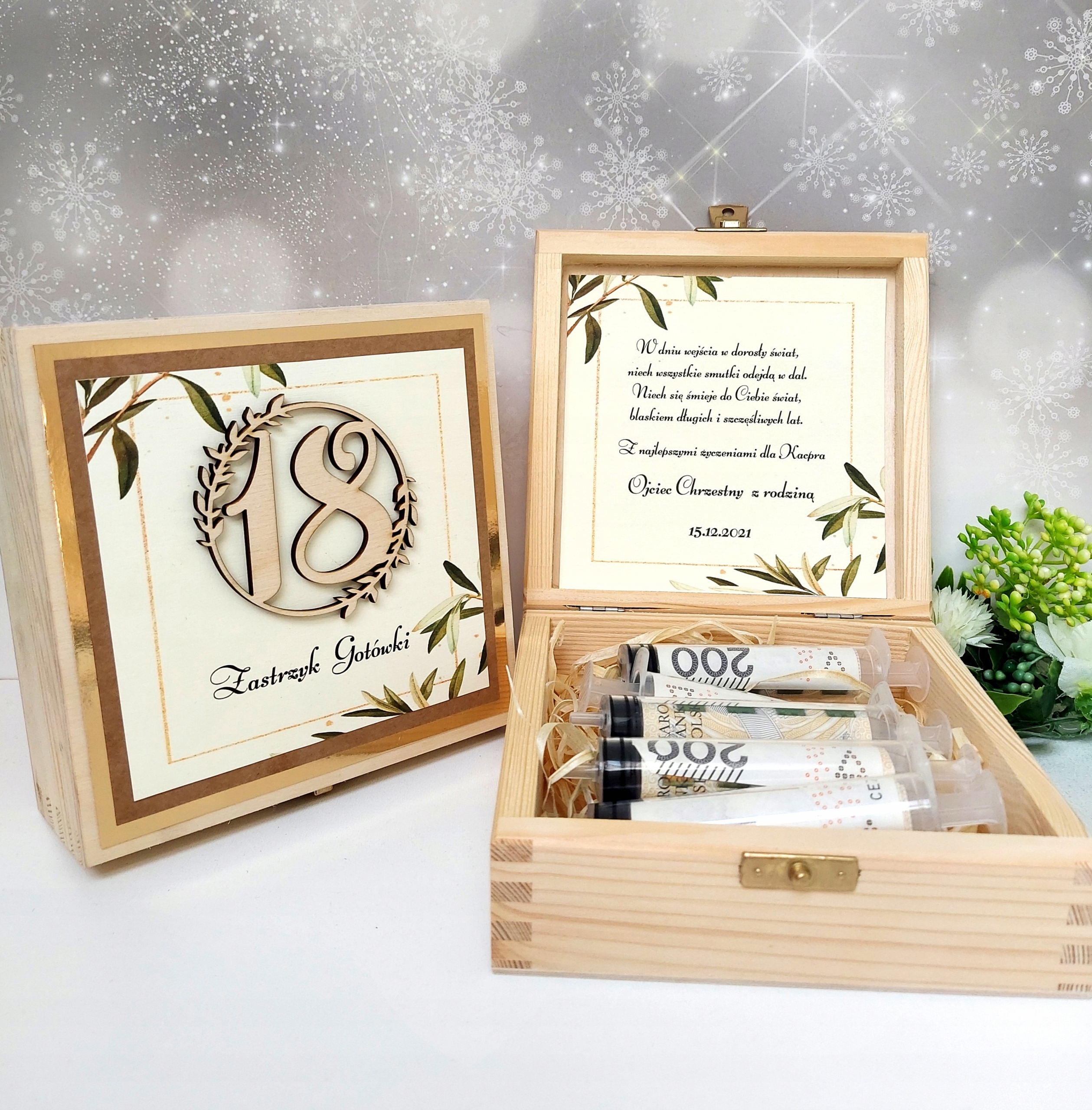 18 -й день рождения - это особый день в жизни каждого молодого человека. Чтобы отпраздновать этот день и придать ей что -то особенное. Персонализированные пожелания внутри. Коробка украшена верхней частью золота и экологической бумаги. ~