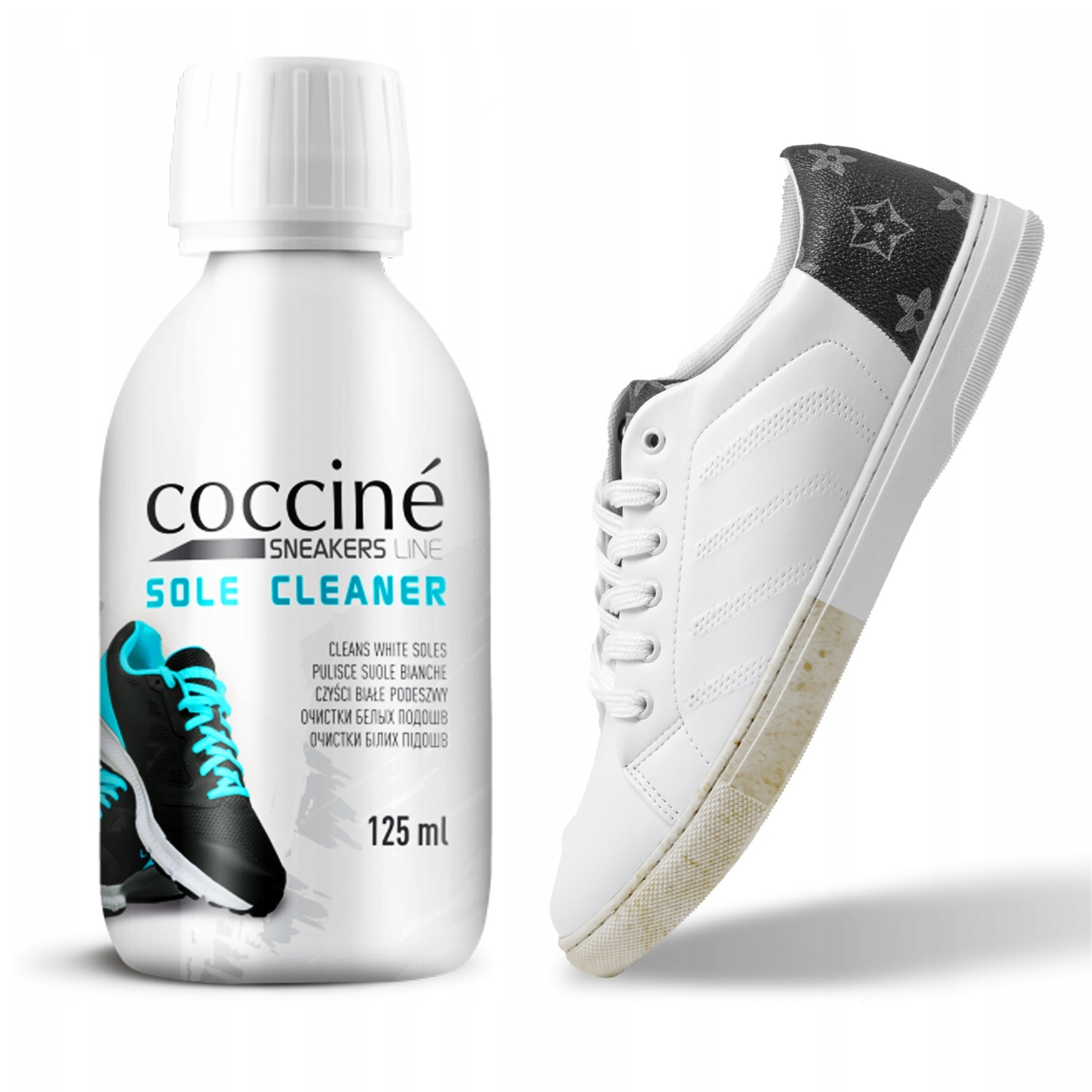 najważniejsze korzyści płynu do podeSzew Coccine кроссовки. Эффективно очищает яркие подошвы - удаляет грязь из белых, бежевых и серых подошв спорта и повседневной обуви, восстанавливая их свежий внешний вид.