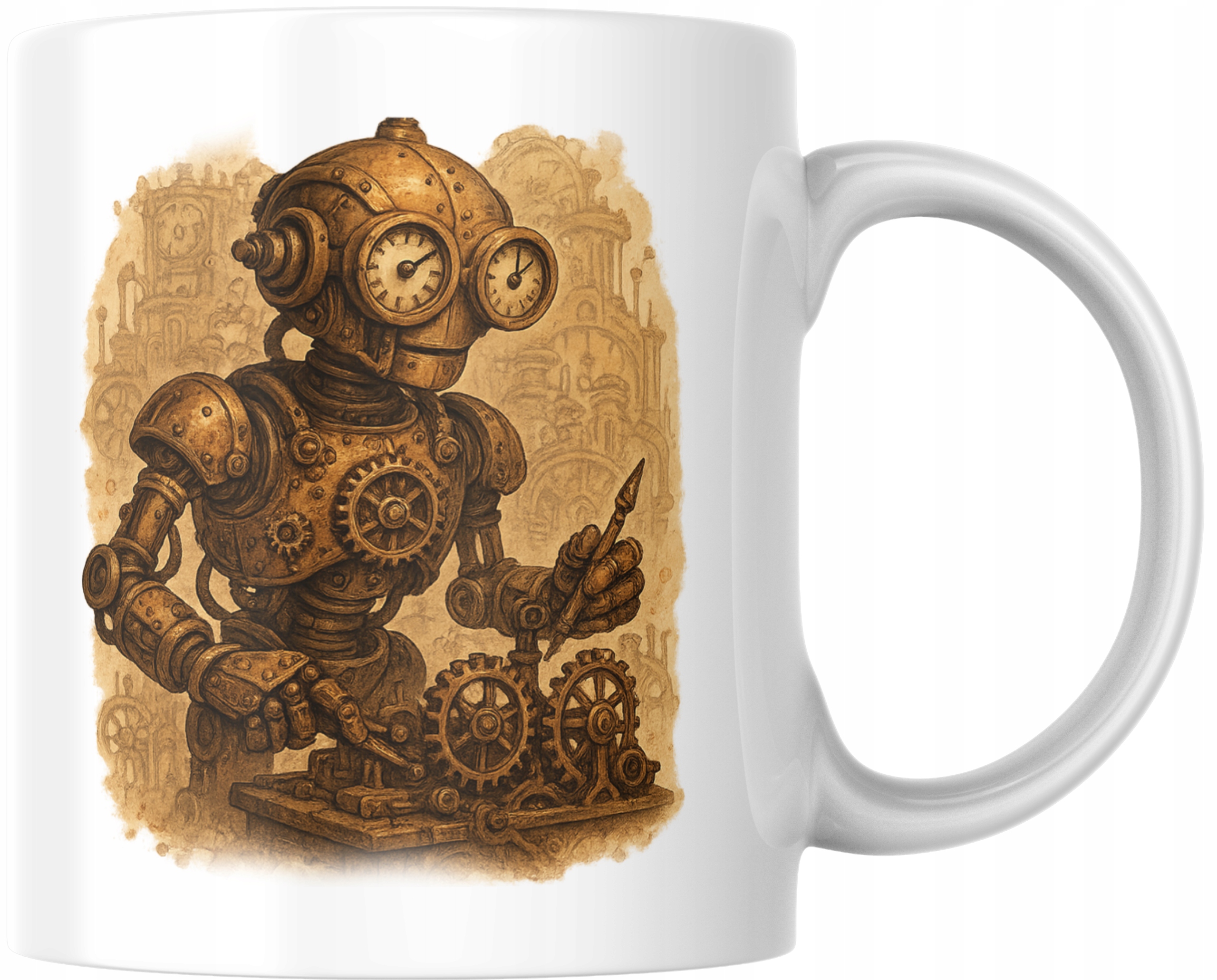 Mug с интригующим роботом стимпанка - конструктор, окруженный винтиками и шестернями, хранится в теплых латунных тонах. Кружка с иллюстрацией, изображающей инженера -механика, идеально подходит в ретрофутуристскую атмосферу.