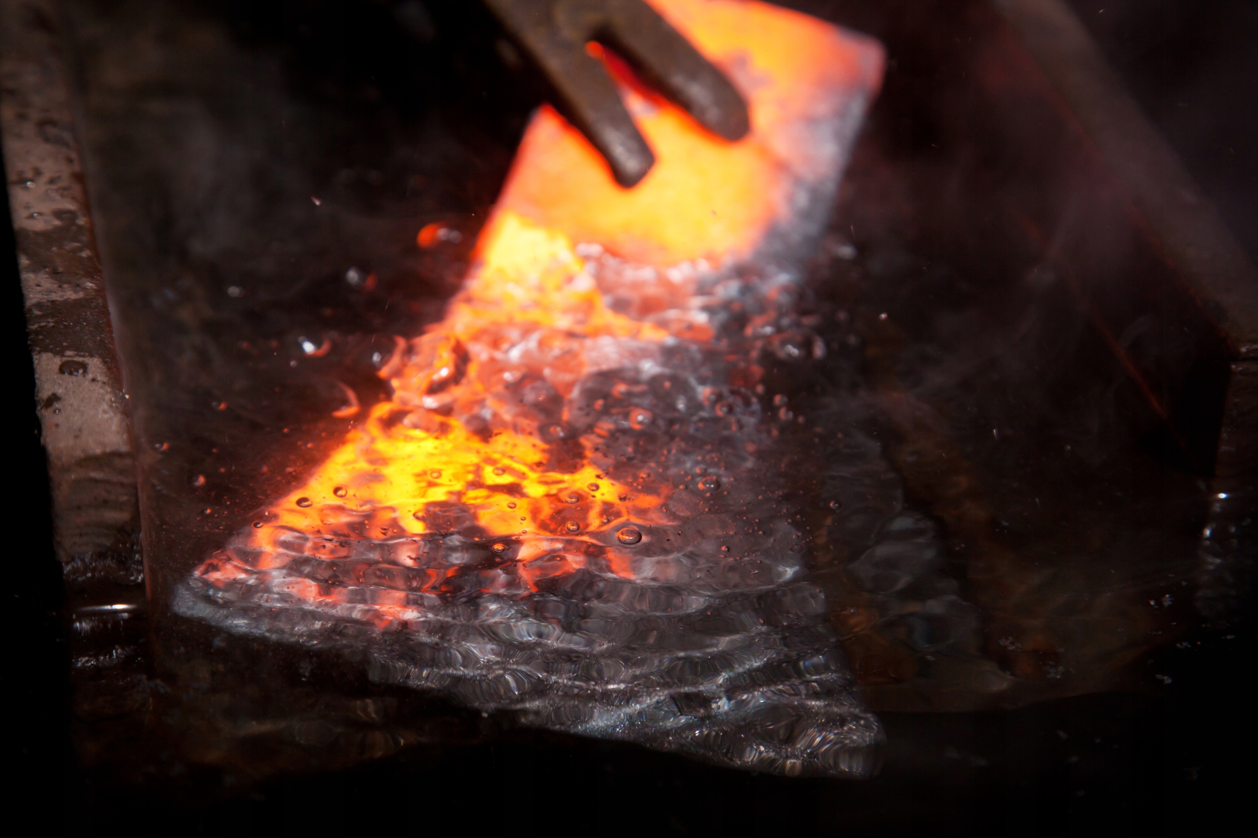 Технологический процесс строго определяется: сталь (шведская сталь типа CK), нагревается до 1200 ° C, а затем образуется с тяжелым прессом (давление в прессе 500T). Инструменты образуются пневматическим молотком с силой удара 150 кг. Из -за такой обработки кузнеца стальные молекулы сжаты и, таким образом, получают наилучшее качество продукта. Следующим этапом является затвердевание стали в масле при ок. 800 C, после чего он снова нагревается до ок. 400 C, чтобы устранить возможные напряжения.