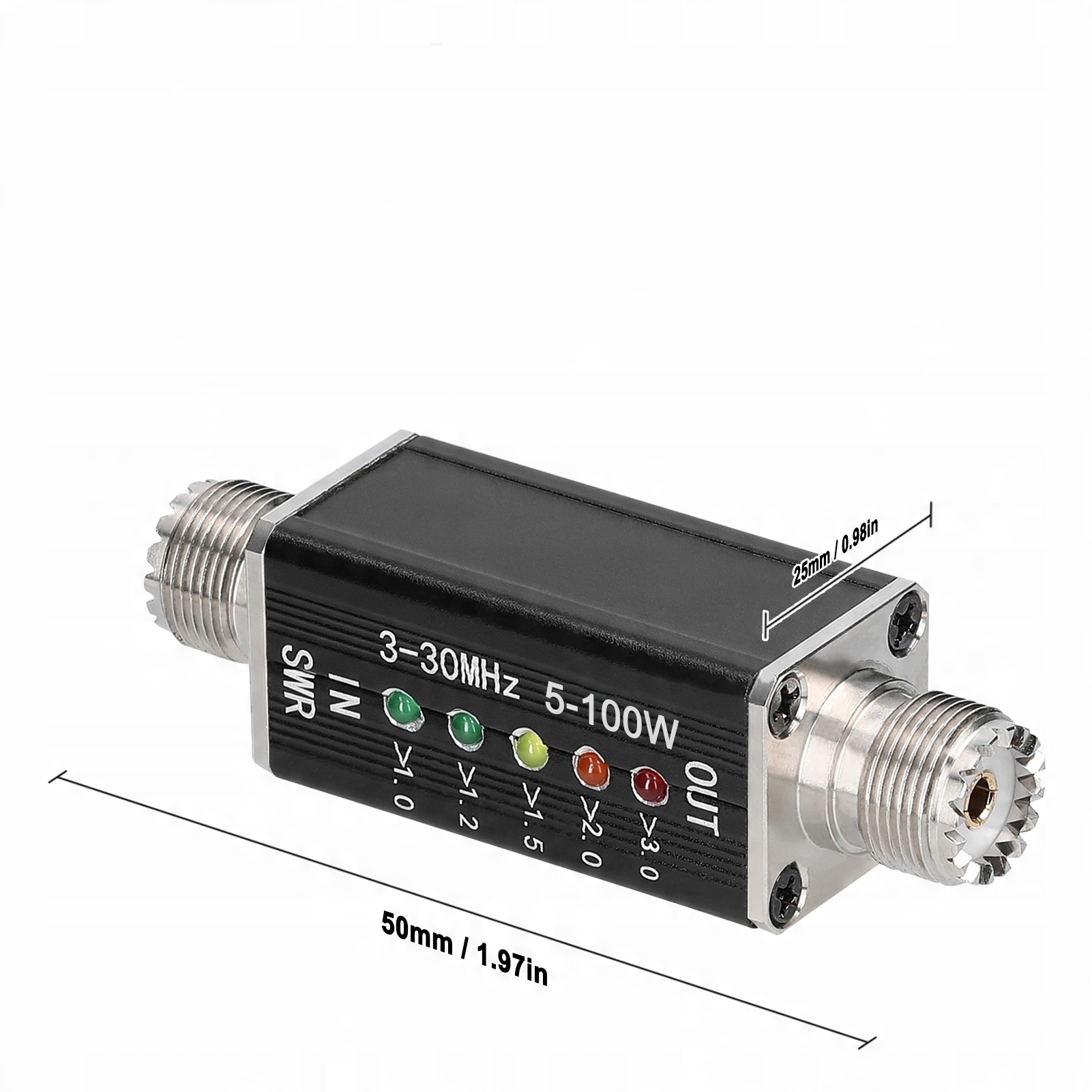 Этот продукт представляет собой короткополосный светодиодный индикатор КСВ-метра. Радиочастотное питание, батарейки не требуются, его легко носить с собой. КСВ-метр — это устройство, используемое для измерения радиочастотных сигналов с помощью 5 светодиодов для индикации уровня сигнала, причем разные цвета обозначают разные диапазоны КСВ. Он используется для измерения и отображения КСВ коротковолновых радиосигналов в диапазоне частот 3-30 МГц. Входная мощность не превышает 100 Вт, самый маленький светодиод (> 1,0 соответствует зеленому свету) требует мощности 5 Вт, подходит для различных коротковолновых радиоустройств.