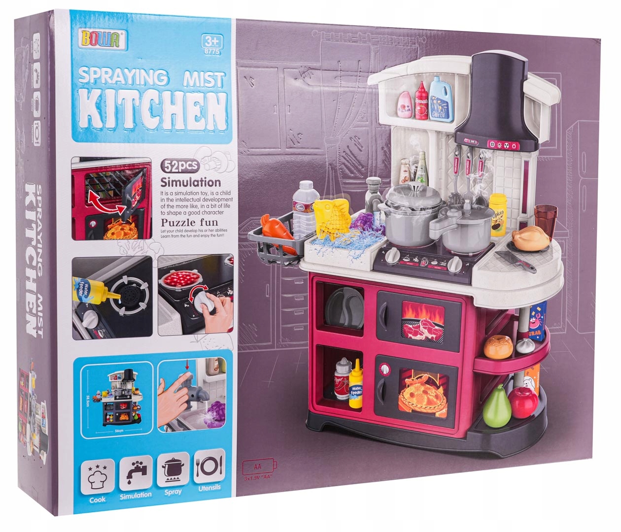 Интерактивная кухня со светом, звуком и краном, из которого течет вода, а также множеством аксессуаров для детей от 3 лет. Кухня изысканно изготовлена из пластика высшего качества и окрашена в яркие цвета, которые побуждают вашего ребенка играть. На кухонной стойке стоит интерактивная плита с конфорками. При повороте одной из ручек вы слышите звуки приготовления, а другой — звуки жарки, сопровождаемые подсветкой конфорок. После добавления в горелку нескольких капель воды выходит холодный пар. Вода действительно течет из крана, как в настоящей раковине, поэтому ребенок сможет мыть игрушечную посуду. В комплект также входит макет духовки с открывающейся дверцей, макет гриля с открывающейся дверцей и множество полок, на которых можно разместить макеты продуктов. Весь набор выглядит великолепно.