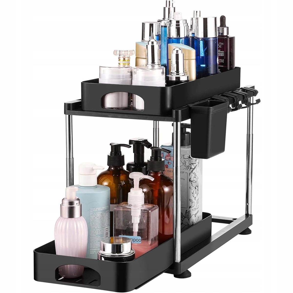 Кухонный организатор помещен в двойной шкаф под подставкой на полке раковины