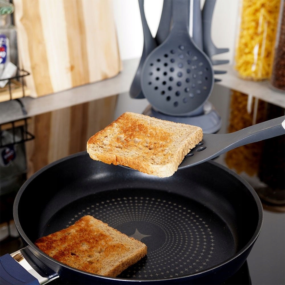 Набор из пяти кухонных принадлежностей с нескользящей подставкой. Материал, из которого изготовлена посуда, обладает высокой жесткостью и долговечностью, и при правильной эксплуатации она прослужит долгие годы. Благодаря подставке хранить посуду будет чрезвычайно легко и удобно. Этот набор позволит нам поддерживать порядок на кухне, а посуда всегда будет на своем месте. Изготовлено в соответствии с европейскими стандартами.