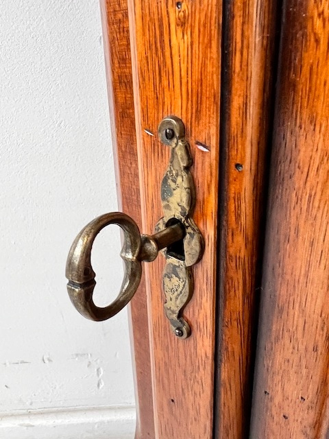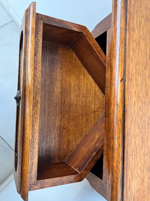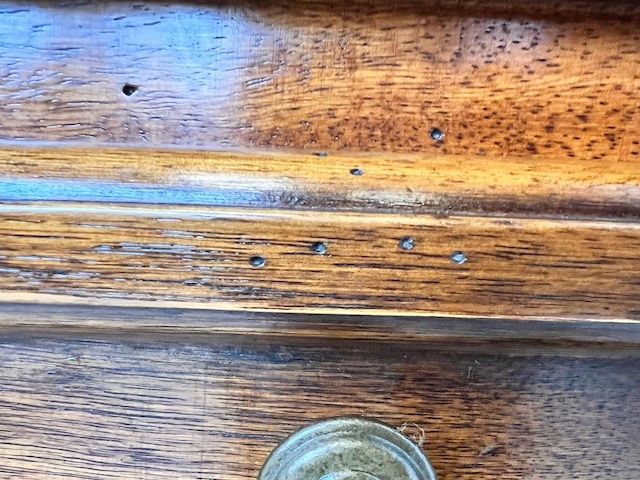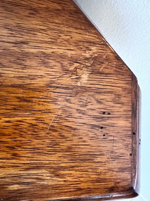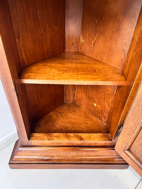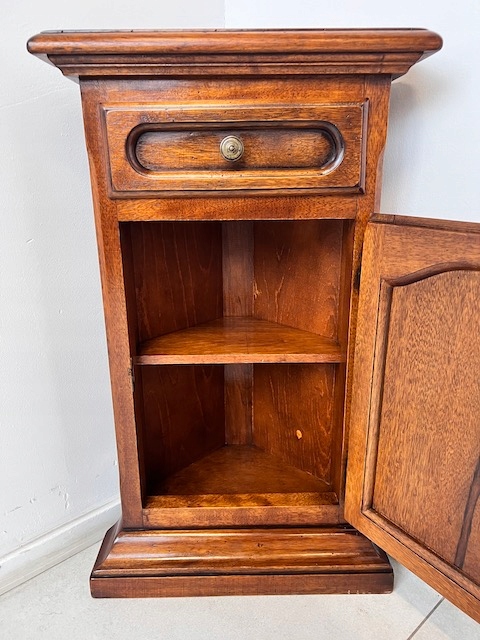 Комод, угловой столбик. Он изготовлен из древесины дуба. Он находится в хорошем состоянии. Единственный недостаток - небольшая царапина на столешнице. Комод стилизован под старину. На нем много точек, которые предположительно напоминают следы короеда. Внутри он хорошо сохранился. Имеет характерные следы использования. Комод готов к установке.