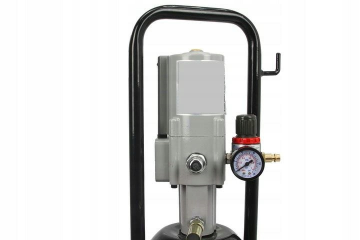 Смазочный шприц оснащен эффективным пневматическим насосом, который при подключении к компрессору позволяет одному человеку работать со смазкой (при использовании ножных смазочных шприцов для смазки необходимы 2 человека).