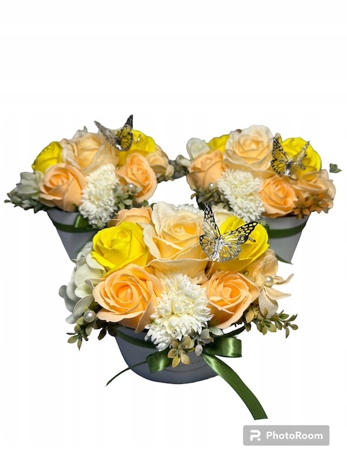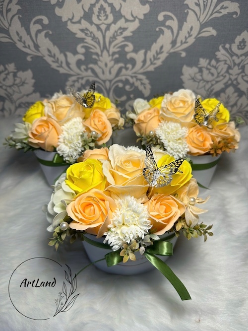 Цветочная коробка с мыльными цветами оранжевого, белого и желтого цветов.