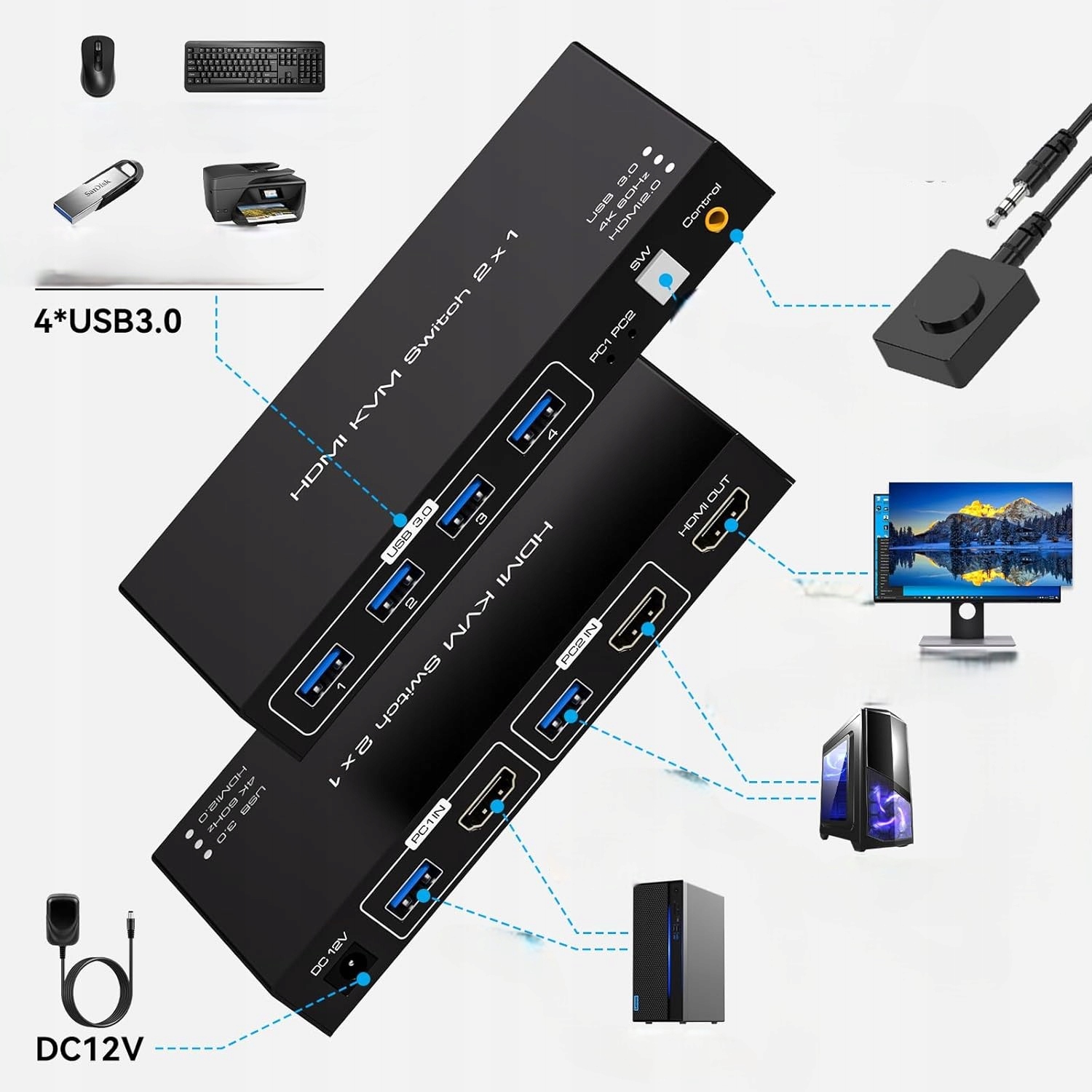 - KVM Switch 2 PC 1 Монитор: KVM HDMI Switch поддерживает 2 компьютера, которые используют общую мышь, клавиатуру и принтер. Вы можете подключить к нему сканеры штрих -кода, жесткие диски USB или другие USB -устройства. Повысить эффективность работы в офисе и играть в комфорт.