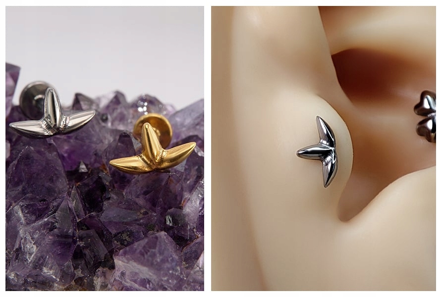 Титановая губка с трехлепестковой гайкой. Шапка, выполненная в форме трех изящных листьев, излучает естественную красоту и сдержанную элегантность. Серьга особенно красиво впишется в раковину и козелок, но носить ее можно практически при любом пирсинге уха, как в мочке, так и в хряще. Надевать эту серьгу можно с помощью нашей булавки для стержней с внутренней резьбой :) Доступен в двух классических цветах:золото и серебро.