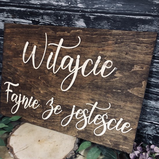 Деревянная приветственная табличка для свадьбы в темном дереве, сделанная из фанеры, смазанного маслом. Кроме того, у него есть надпись «Привет, это приятно, что ты» в естественном деревянном цвете.