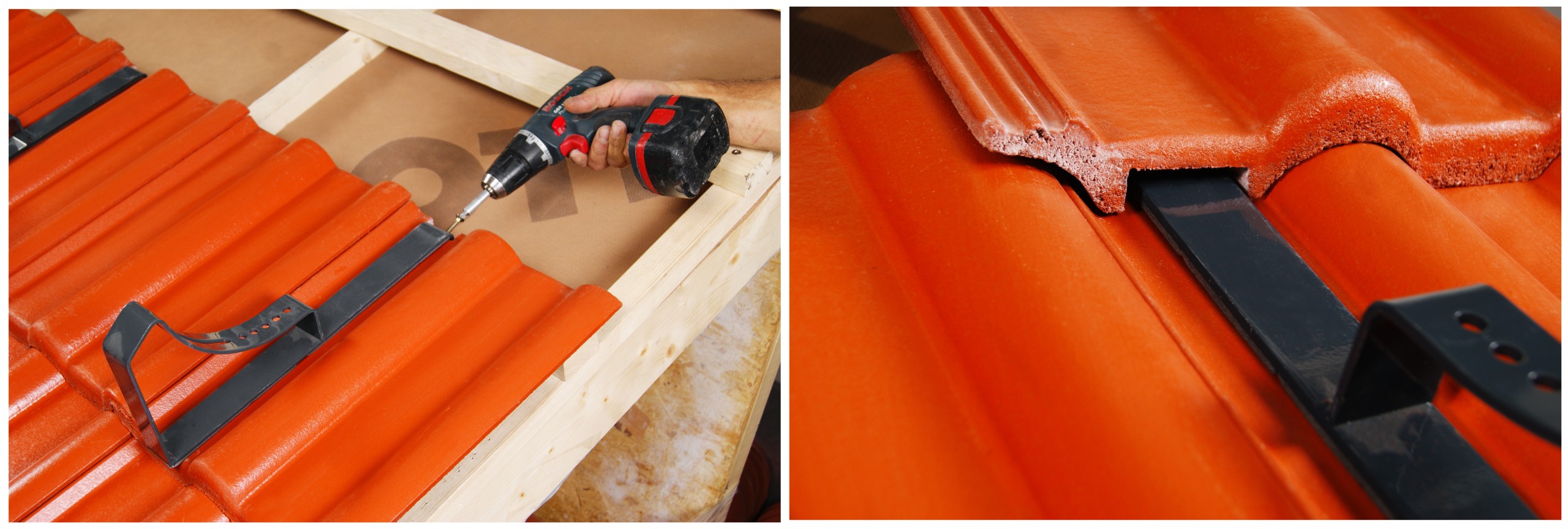 Соответствующее профилирование кронштейна DBDC-KARP позволяет устанавливать опоры или ступени на крышах, покрытых керамической черепицей внахлест, бетонной черепицей и плоской черепицей.