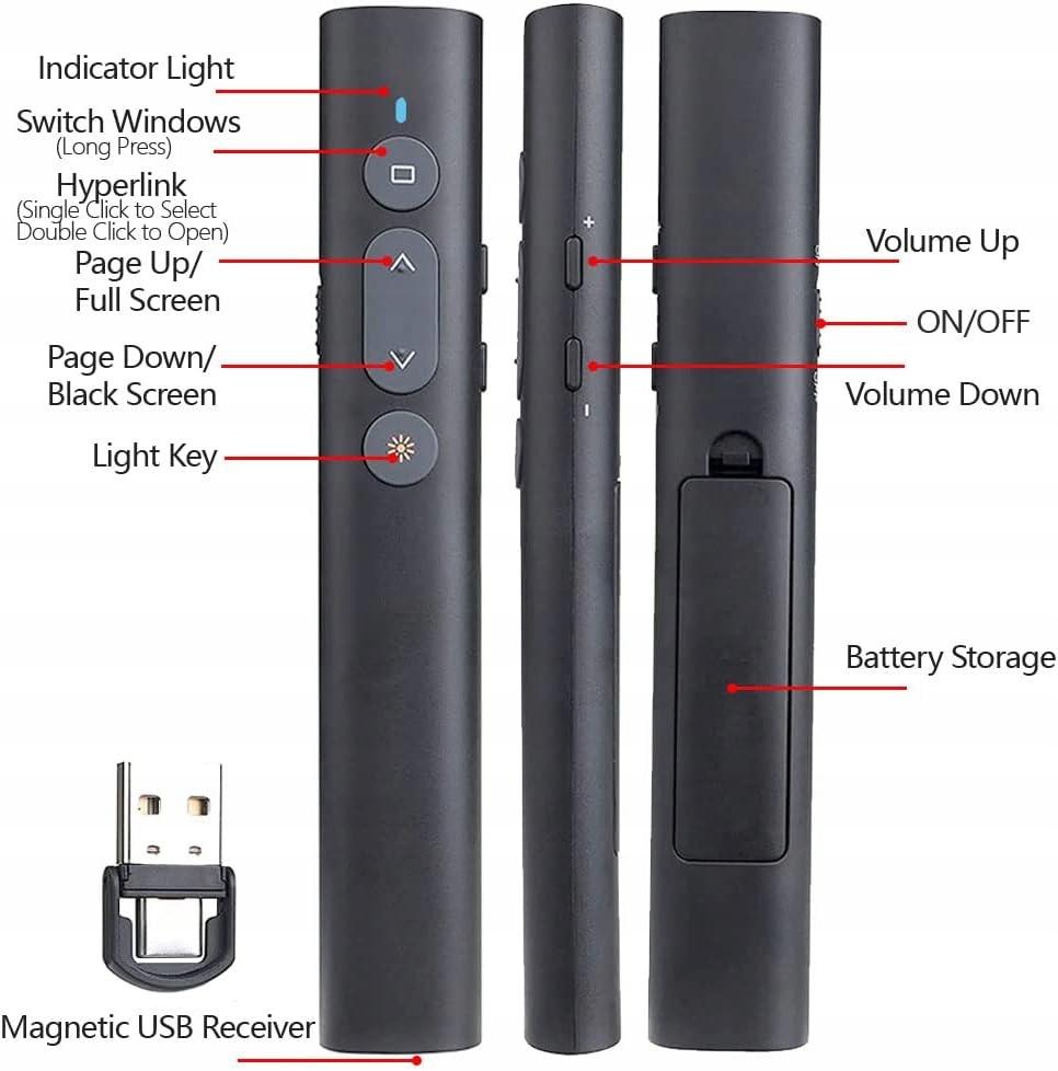 Этот кликер для PowerPoint поддерживает гиперссылку, регулировку громкости, переключение окон, полный/черный экран, перемещение вверх/вниз. Перезаряжаемый ноутбук Powerpoint Clicker светится ярко-красным светом, который хорошо виден на большинстве фонов (не рекомендуется для светодиодных/ЖК-экранов). Дальность управления компьютерным кликером - до 30М, дальность действия красного света - до 200М.