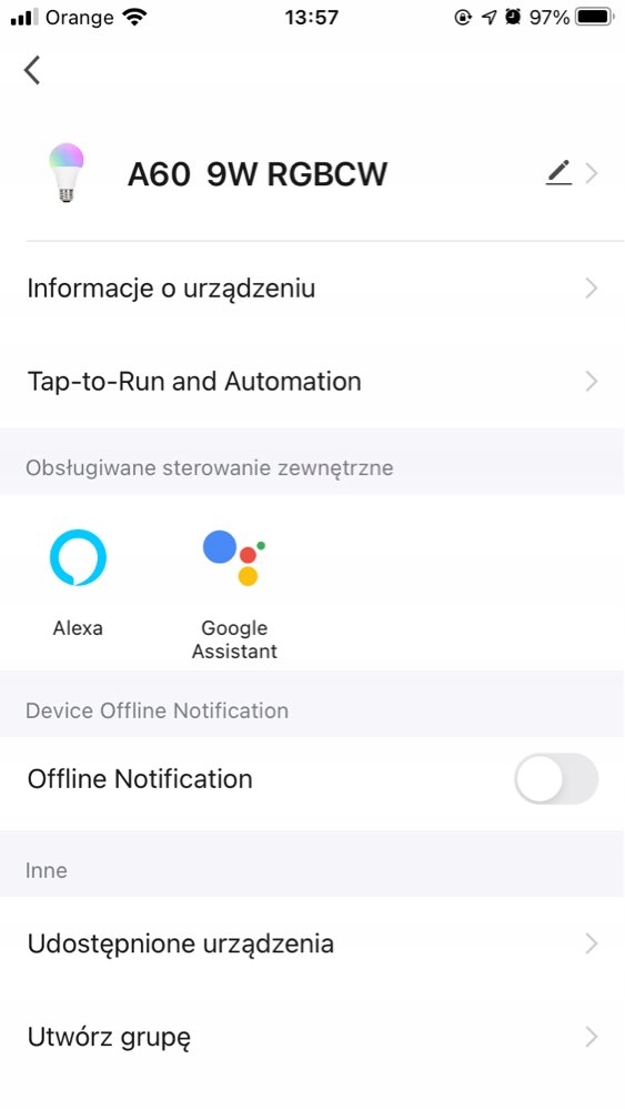 Приложение позволяет нам полностью управлять лампочкой - мы можем изменять цвет света, уменьшать, настроить в соответствии с доступными сценами, выбрать один из запрограммированных типов освещения, создать индивидуальный профиль освещения или включить свет в ритме музыки. Кроме того, приложение имеет функцию таймера и запоминает настройки. Мы также можем объединять продукты в группы и управлять ими одновременно, а также делиться возможностью управления ими с другими людьми.