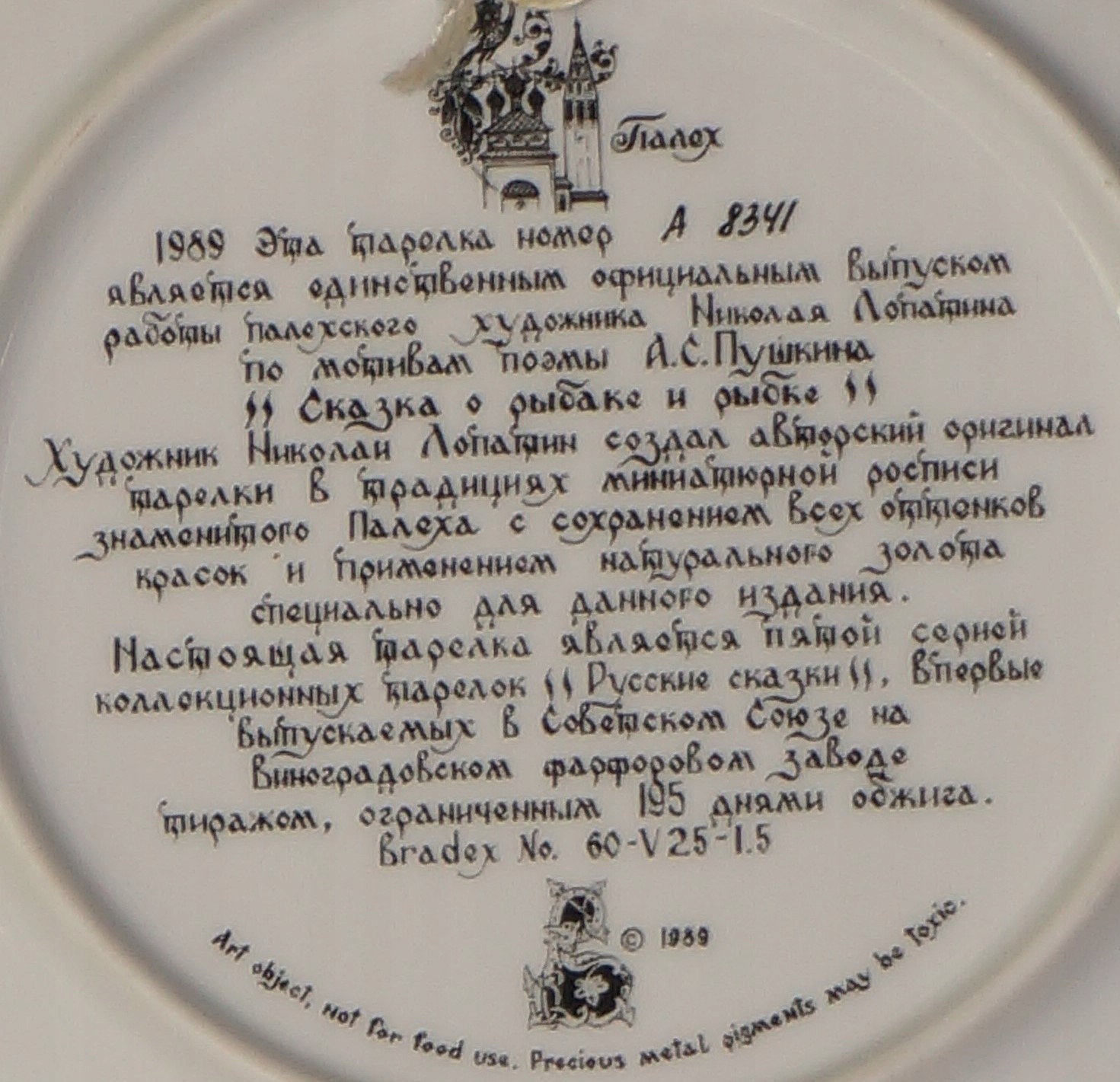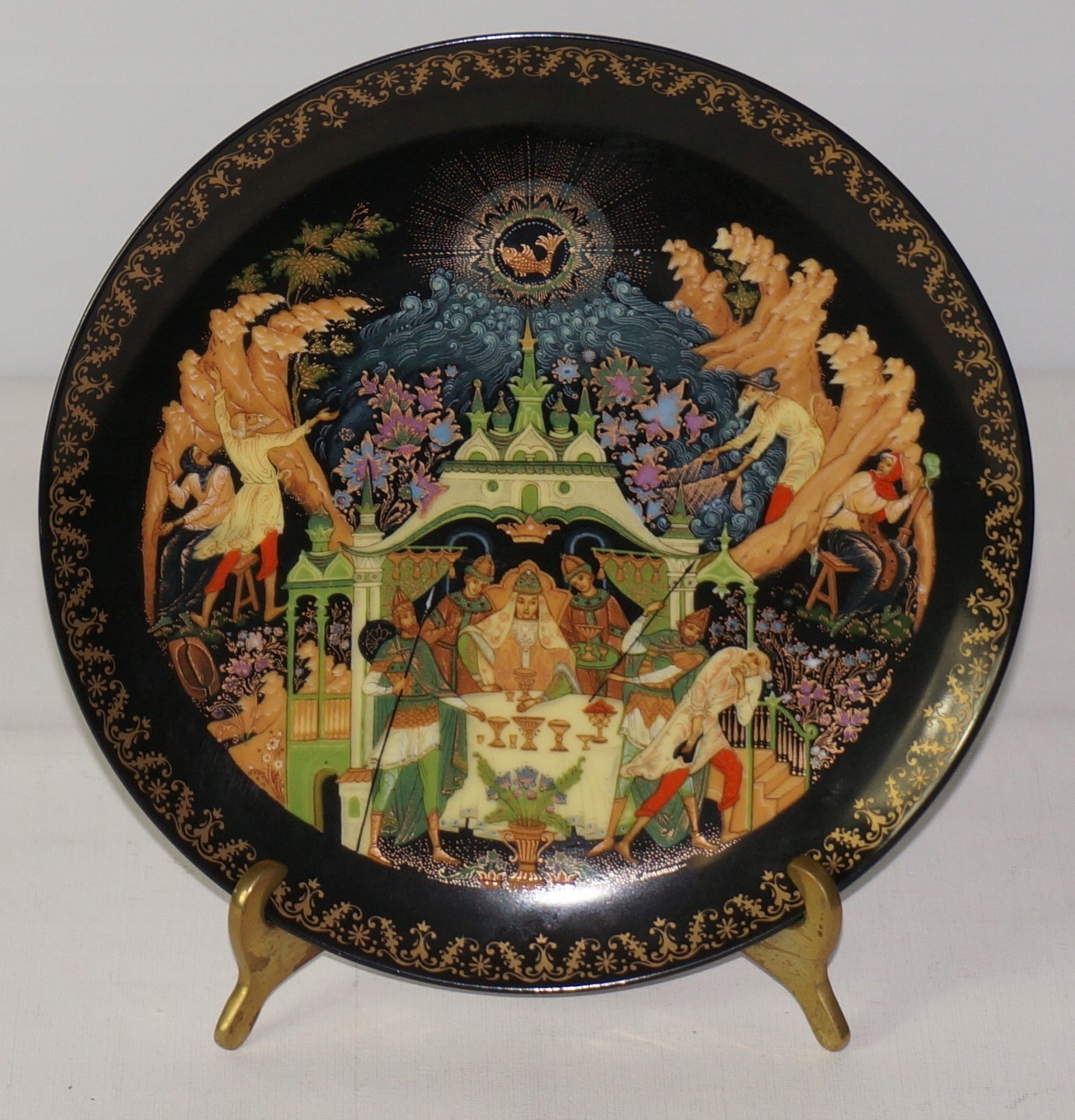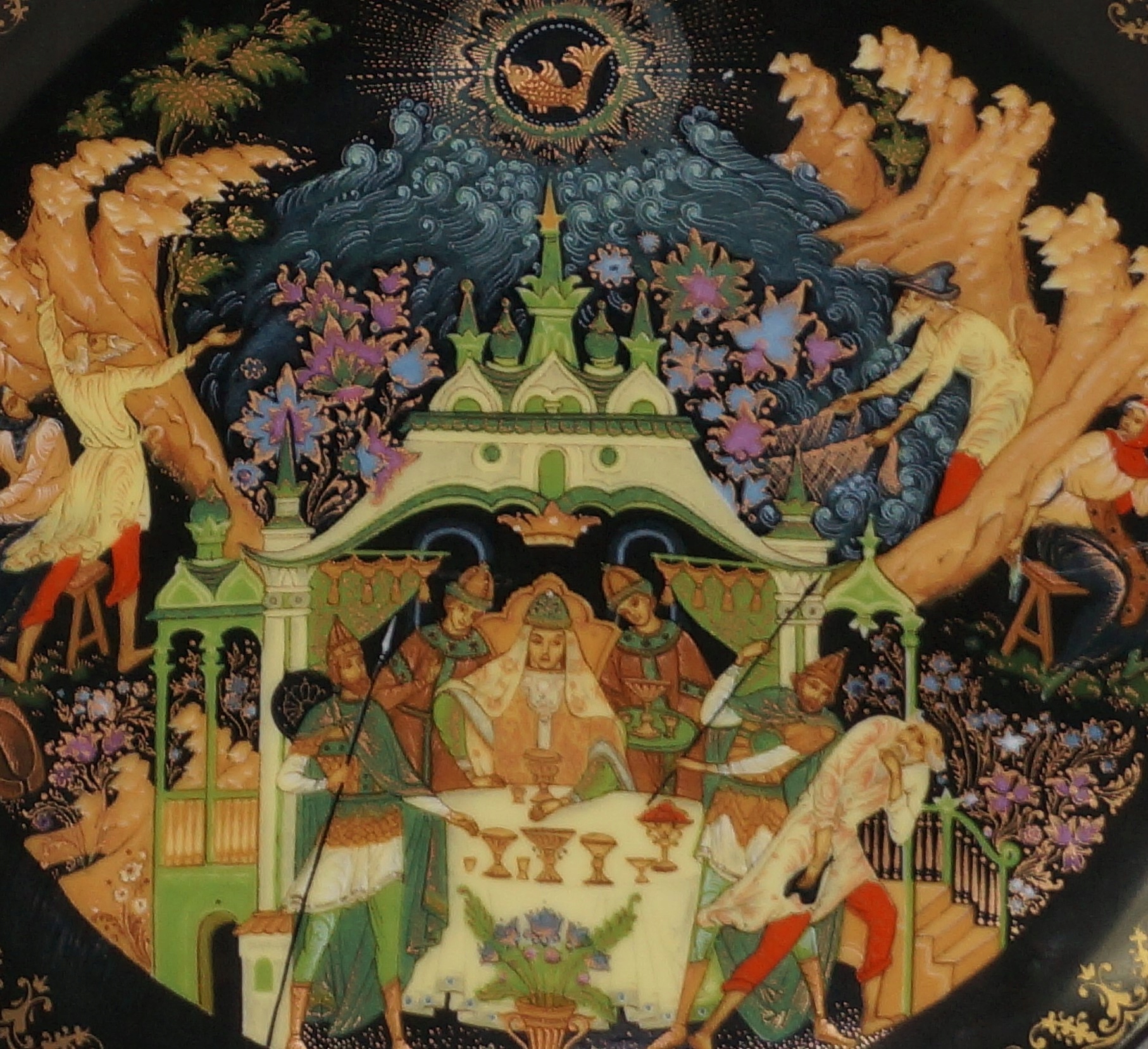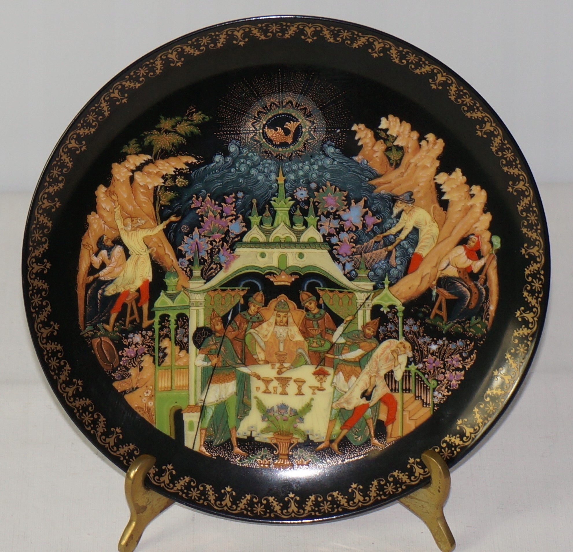 Предлагаю декоративную тарелку из серии «Русские легенды» 1988 года.Серия состоит из 12 тарелок, то есть 12 сказок и легенд. Удивительные цвета и детали были достигнуты благодаря 16-17 слоям пигментов и выделены 18-каратным золотом, время обжига составило 195 дней. За проект «ответственен» Роман Львович Белоусов, а изготовлены эти пушки на историческом Виноградском фарфоровом заводе. Эта тарелка - сказка о рыбаке и рыбке.