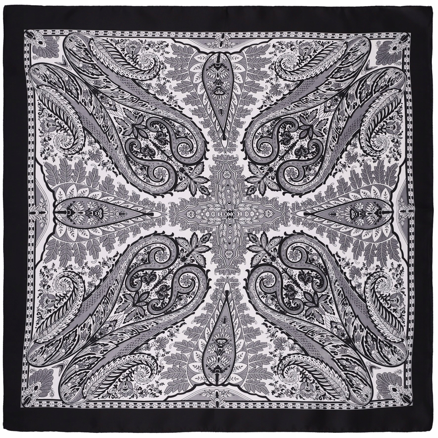 Добавьте в свой гардероб вечный элемент в форме шарфа 70x70 см, изготовленного из тонкого материала, такого как шелк. Его легкая структура и тонкий блеск делают его стильным и чрезвычайно удобным для ношения. Узор Пейсли, богатый восточными мотивами листьев и цветов, подчеркивает утонченный характер этого добавления. В классическом черном, с деталями в оттенках белого и серого шарф источает элегантность и универсальность, идеально подходит для всех случаев.