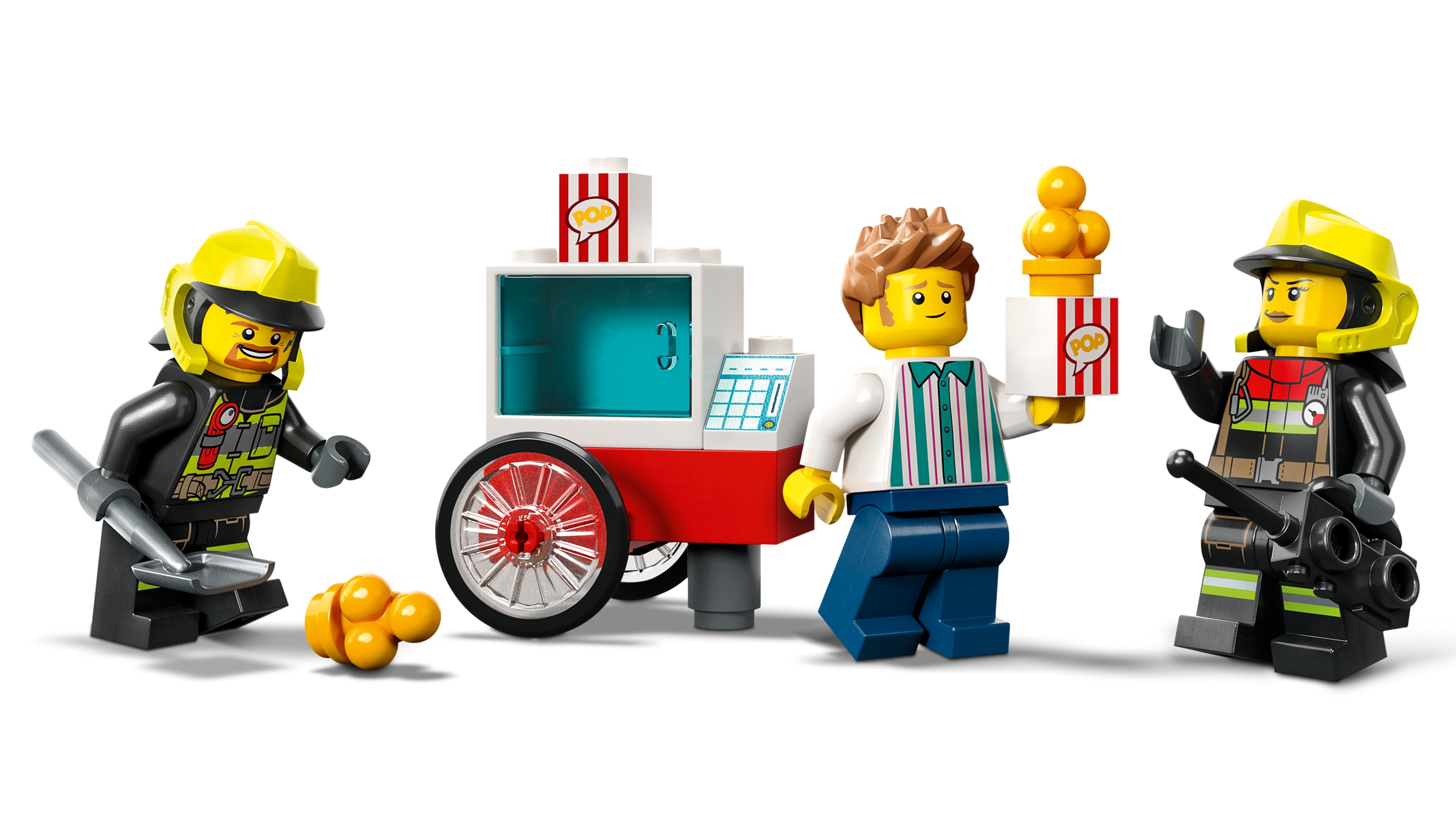 - Что в коробке? - Все, что вам нужно для построения пожарной станции и пожарной машины, а также колясью с попкорном, пламенем LEGO® и минифигурками продавца и двух пожарных
