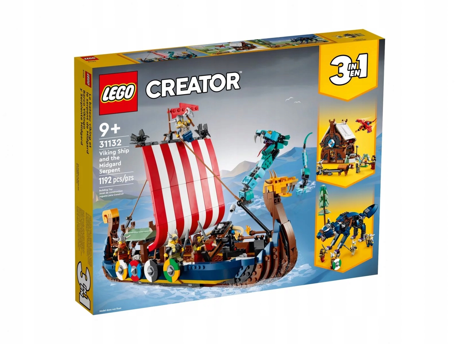 Три игрушки в одном наборе «Викинг» — LEGO® Creator 3in1 Корабль викингов и змей Мидгарда (31132) порадует малышей моделями корабля, дома и волка Фенриса Безграничные возможности для развлечений: дети могут выбрать одно из трех приключений викингов. Будут ли они сражаться с опасной змеей на корабле, построят дом викингов и дракона или разыграют битву между нордическим волком и четырьмя викингами? Чрезвычайно подвижные модели: у змеи Мидгарда подвижная голова, хвост, тело, челюсть и плавники, а у волка — подвижная шея, челюсть и ноги. Благодаря этому дети могут разыгрывать сценки, в которых происходит очень многое. Множество возможностей: корабль викингов оснащен 8 щитами, баллистой с шипометом, сборной коровой и двумя сборными воронами. Дом викингов имеет съемную крышу. Четыре минифигурки — в комплект входят четыре минифигурки вооруженных викингов, позволяющие разыгрывать истории с кораблем, домом или волком. Достойная модель — этот конструктор, состоящий из 1192 деталей, позволяет детям от девяти лет и старше весело строить вместе с друзьями или родителями. Отличное украшение - корабль викингов высотой около 27 см, длиной 42 см и шириной 17 см, поэтому станет интересным украшением детской комнаты. Интерактивные цифровые инструкции. С помощью приложения LEGO® Building Instructions дети могут масштабировать, вращать и визуализировать цифровую версию модели, которую они собирают, на своем смартфоне или планшете. Высокое качество — уже более шести десятилетий мы производим кубики LEGO®, которые каждый раз легко разбираются. Безопасность гарантирована: строительные кубики LEGO® соответствуют самым высоким мировым стандартам безопасности