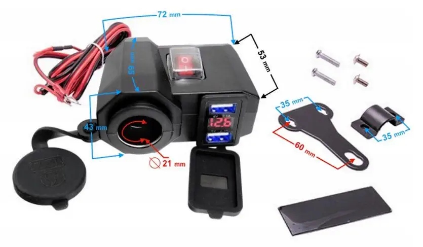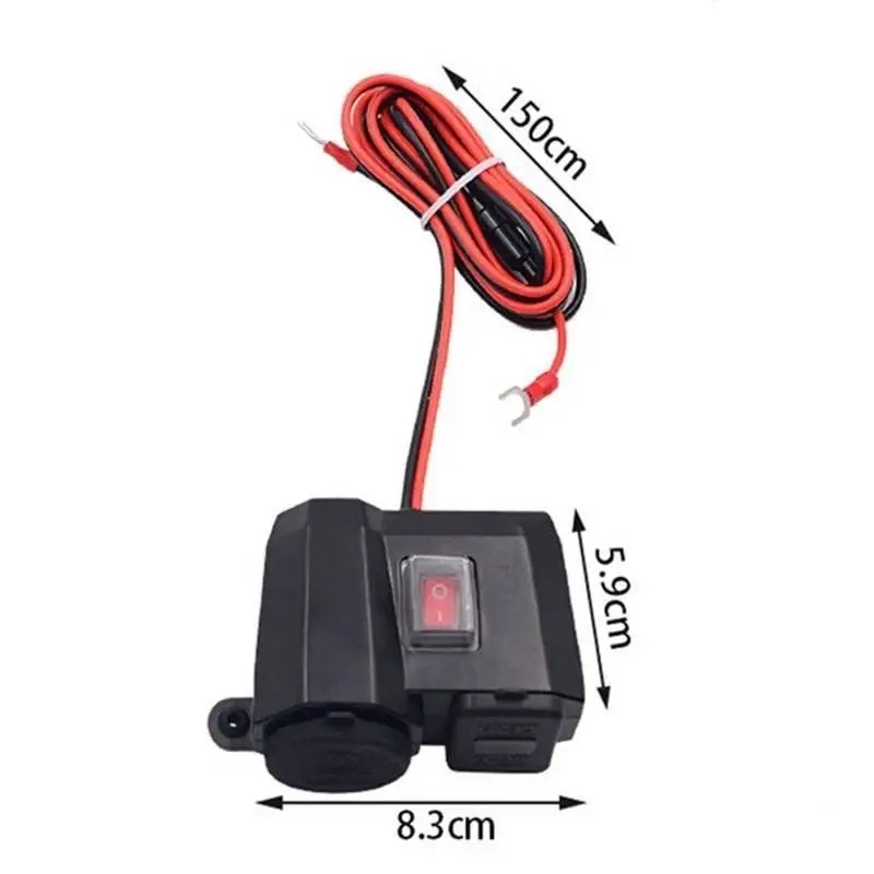 Водонепроницаемый мотоцикл, скутер, на четырех легкий гнездо. Он был оснащен вольтметровым , показывающим напряжение зарядки аккумулятора. Кроме того, он имеет два порта USB 2.1A