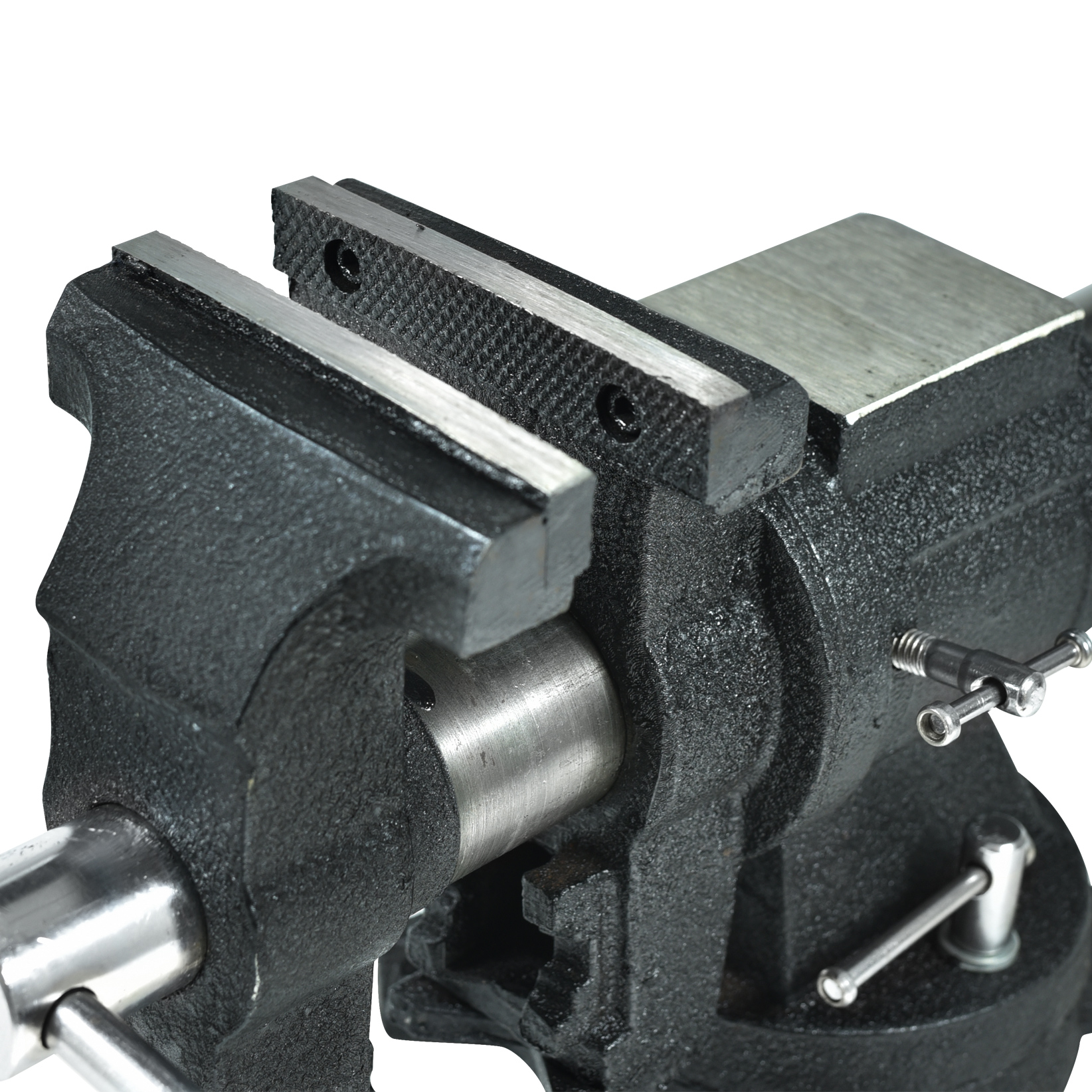В хорошо оборудованной мастерской или домашнем гараже без тисков не обойтись. Это инструмент, позволяющий выполнять множество работ, где заготовка должна быть неподвижной. Дополнительно имеет поворотное основание, позволяющее установить элемент в нужное положение. Тиски можно надежно прикрепить к рабочему столу с помощью отверстий в широком и прочном основании. Очень прочная и жесткая конструкция тисков обеспечивает передачу тяжелых грузов и гарантирует длительный срок службы. Тиски устойчивы к плохим погодным условиям. Благодаря основанию с четырьмя крепежными отверстиями и прочной направляющей тиски остаются чрезвычайно устойчивыми даже при работе с тяжелыми грузами, оставаясь при этом полностью вращающимися. Помимо стандартных губок тиски также оснащены губками для крепления труб.
