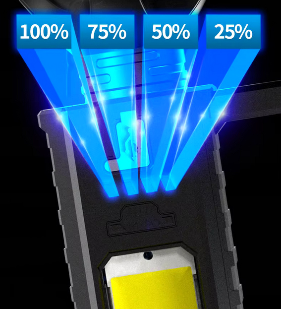 Дополнительная низкоэнергетическая COB-панель, используемая сбоку фонаря, обеспечивает мягкий, широко освещающий яркий белый свет или красный стробоскопический свет, который можно использовать в аварийных и предупреждающих ситуациях.